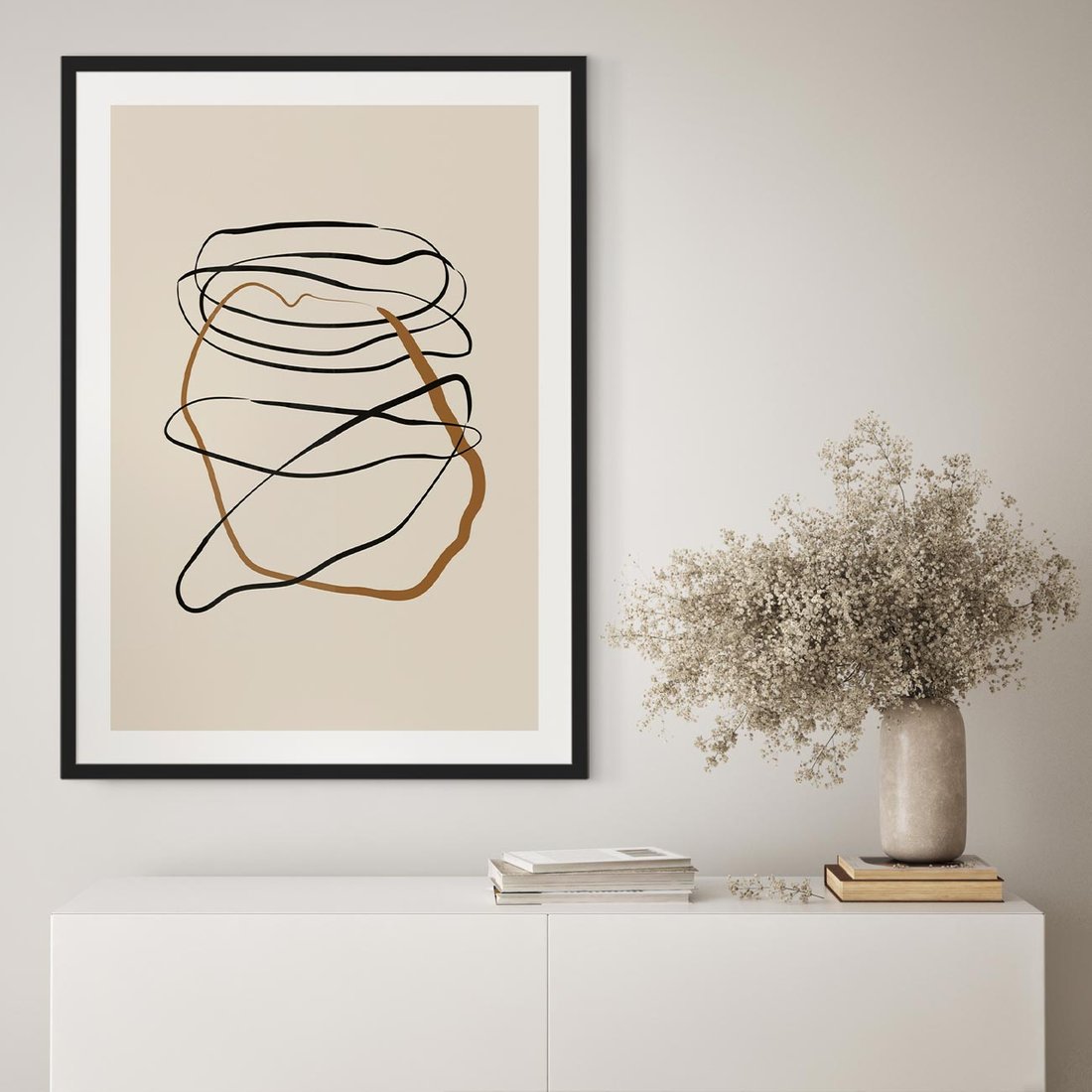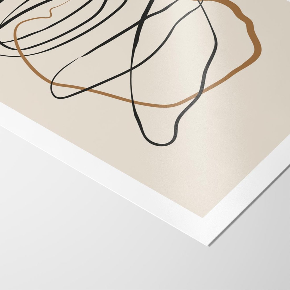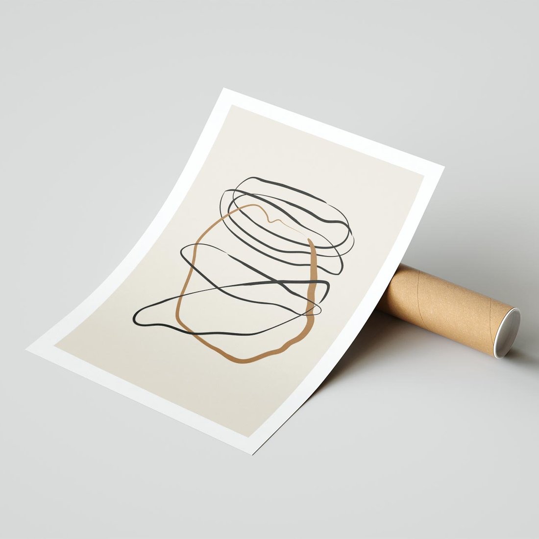 Ten plakat przedstawia abstrakcyjne, zaplątane linie na spokojnym beżowym tle, które tworzą minimalistyczną kompozycję. Sztuka ta eksploruje złożoność relacji między liniami i przestrzenią, tworząc dynamiczny i zarazem harmonijny obraz, który zachęca do refleksji i stanowi subtelną ozdobę dla Twojego wnętrza.