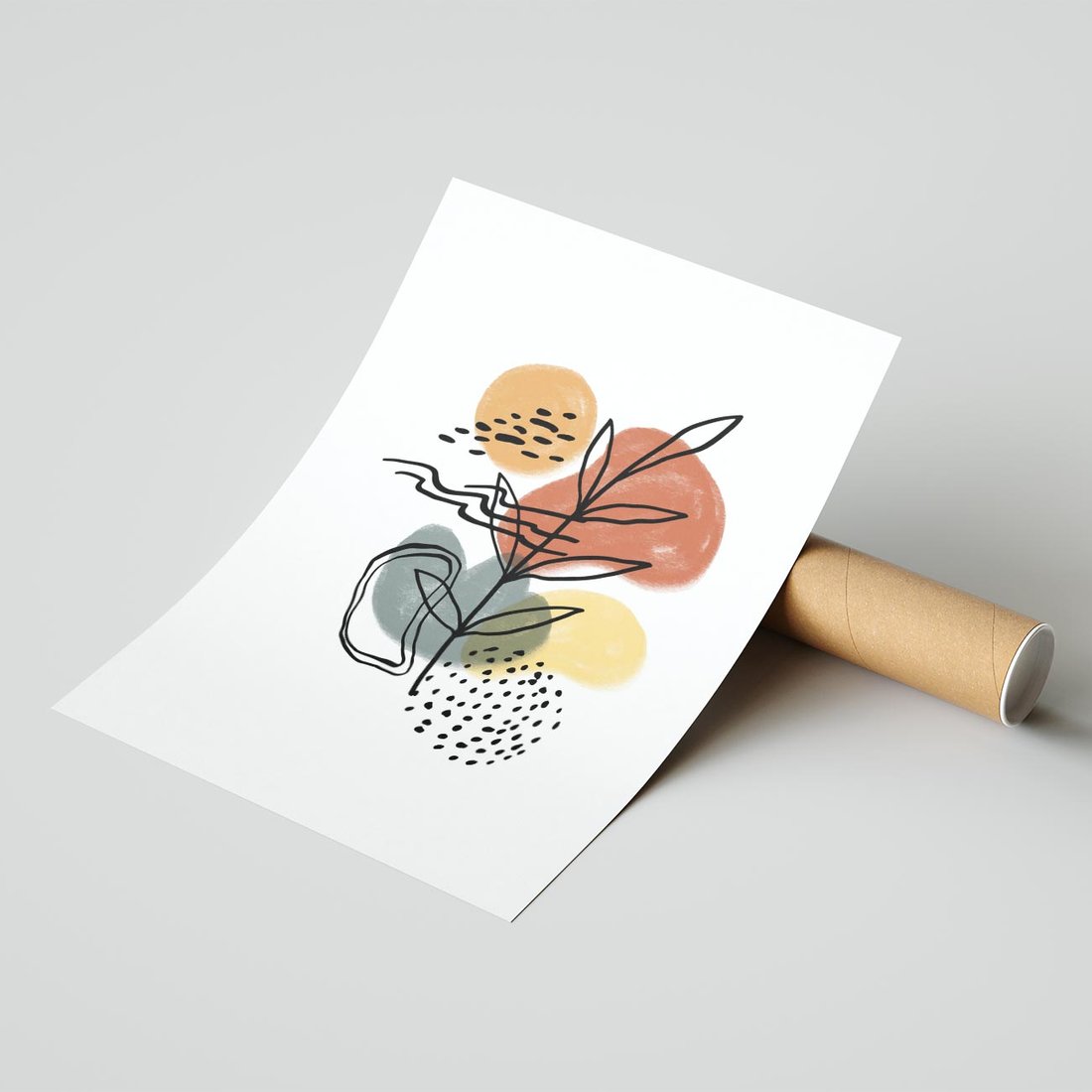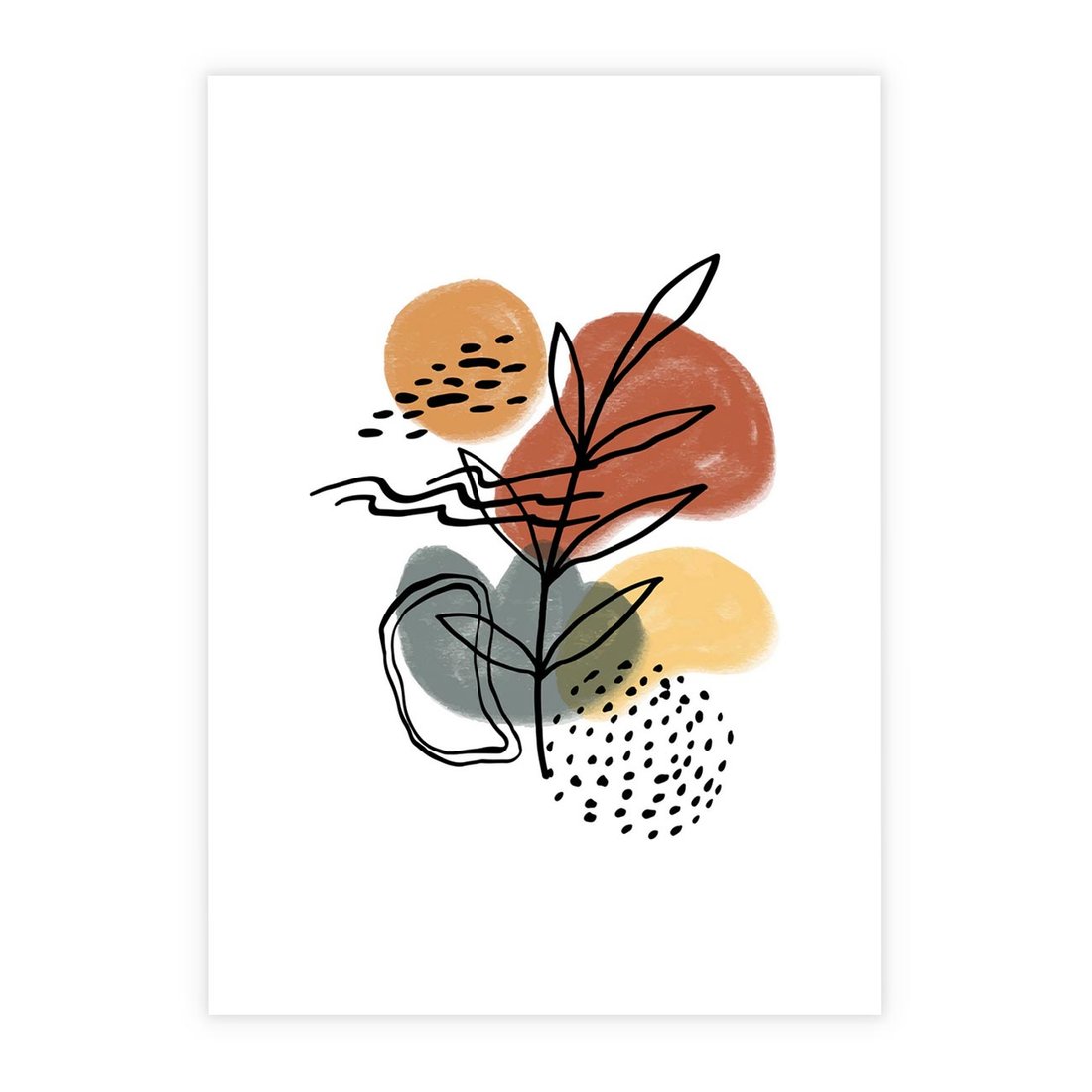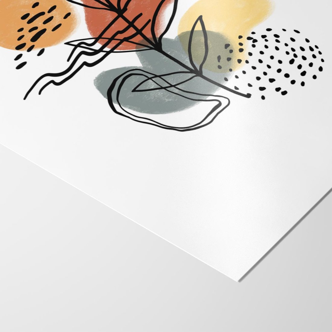 Nasza nowoczesna sztuka to abstrakcyjna kompozycja, w której czarne szkice elementów roślinnych łączą się z delikatnymi akwarelowymi plamami. To artystyczne połączenie przynosi do Twojej przestrzeni wyjątkowy wygląd, tworząc dynamiczną i interesującą atmosferę.