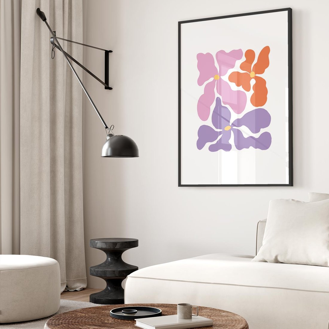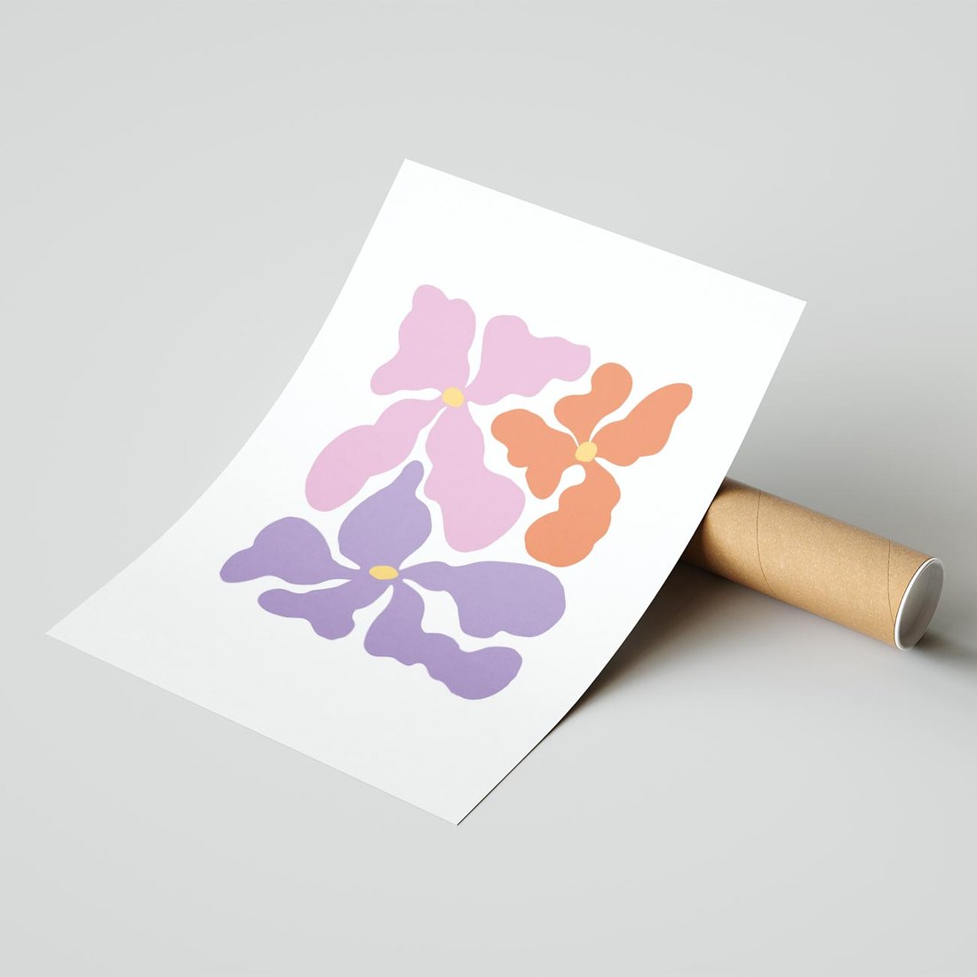 Ten plakat ukazuje abstrakcyjne, kolorowe kwiaty w minimalistycznym stylu, w subtelnych odcieniach pasteli. Sztuka ta harmonicznie łączy wyraziste kolory z prostotą kompozycji, tworząc spokojny, lecz jednocześnie wibrujący obraz, który wzbogaca Twoją przestrzeń i przyciąga wzrok.