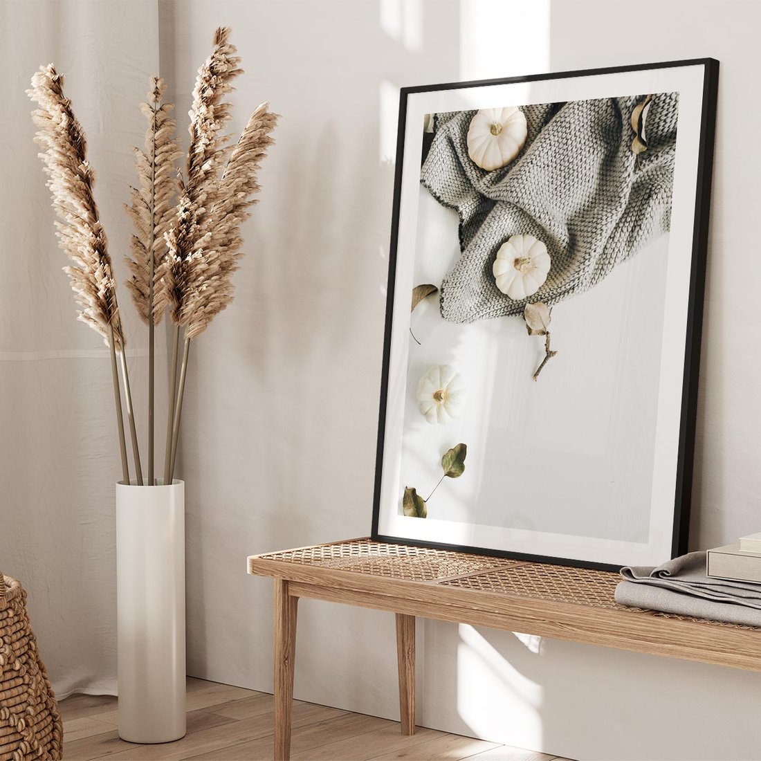 Plakat bez ramy 21x30 - Białe Dynie i Przytulny Koc - kompozycja jesienna, białe dynie
