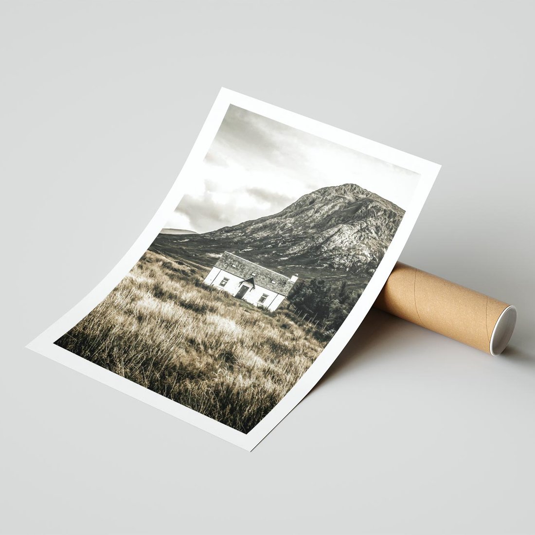 Plakat bez ramy 21x30 - Biały Domek w Sepii: Wiejski Urok - domek w górach, kolory sepii