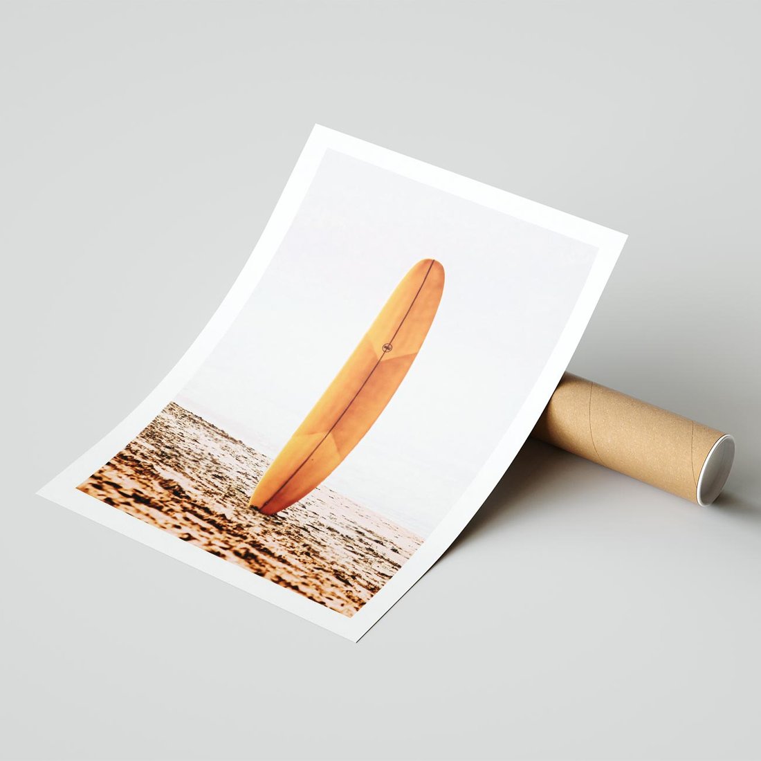 Plakat bez ramy 21x30 - Deska w Piasku: Gotowa na Fale - plaża, pomarańczowa deska surfingowa wbita w piasek