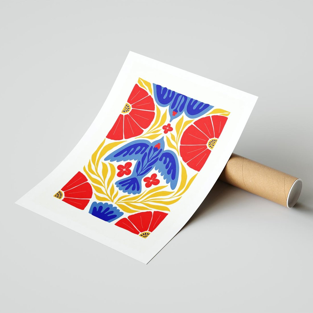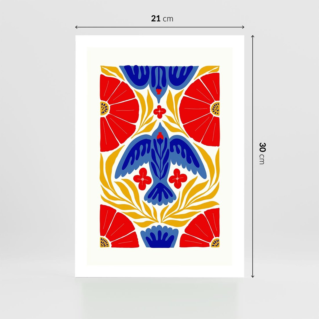 Wyrazista grafika ożywa mocnymi barwami czerwieni, niebieskiego i żółtego. Centralny ptak otoczony czerwonymi kwiatami tworzy dynamiczną kompozycję, która przyciąga wzrok i wzbudza emocje.