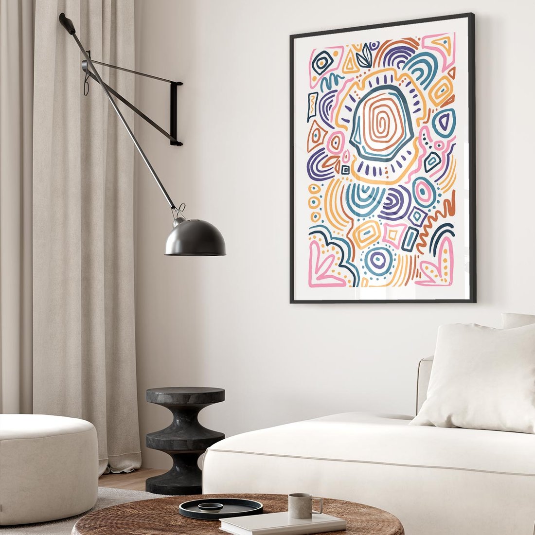 Ten nowoczesny plakat przedstawia kolorowe etniczne wzory o tęczowych i żywych kolorach. To wyraziste połączenie wzorów i kolorów wprowadza do Twojej przestrzeni energię i żywiołowość, tworząc jednocześnie interesujący akcent artystyczny.