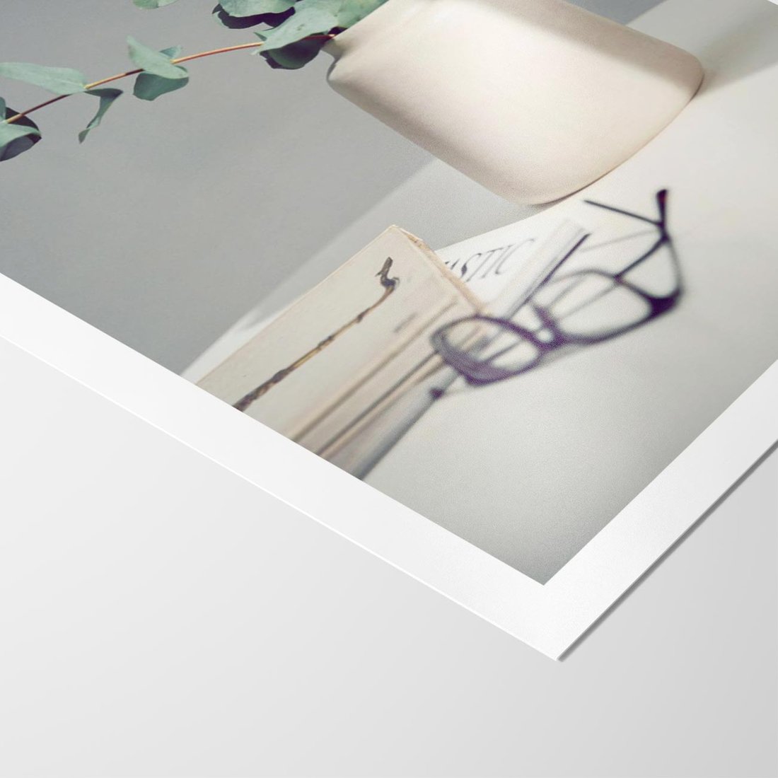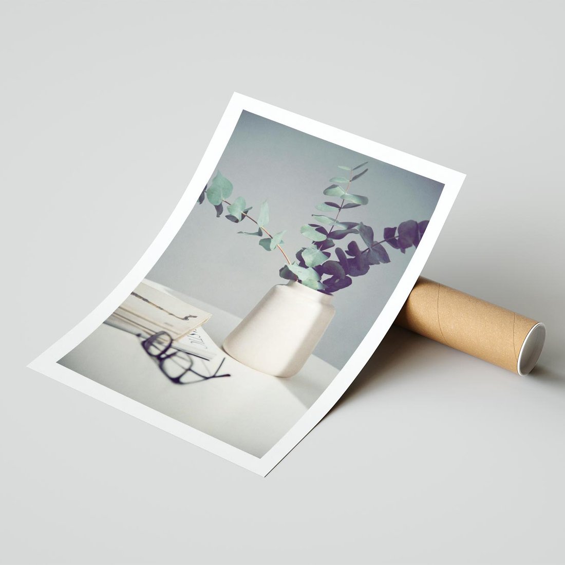 Obraz przedstawia kompozycję z liści eukaliptusa w wazonie, gazetą i okularami. Ta aranżacja oddaje atmosferę relaksu i czytania w spokojnym otoczeniu, doskonale pasując do wnętrz, które pragną wyrazić harmonię i spokój.