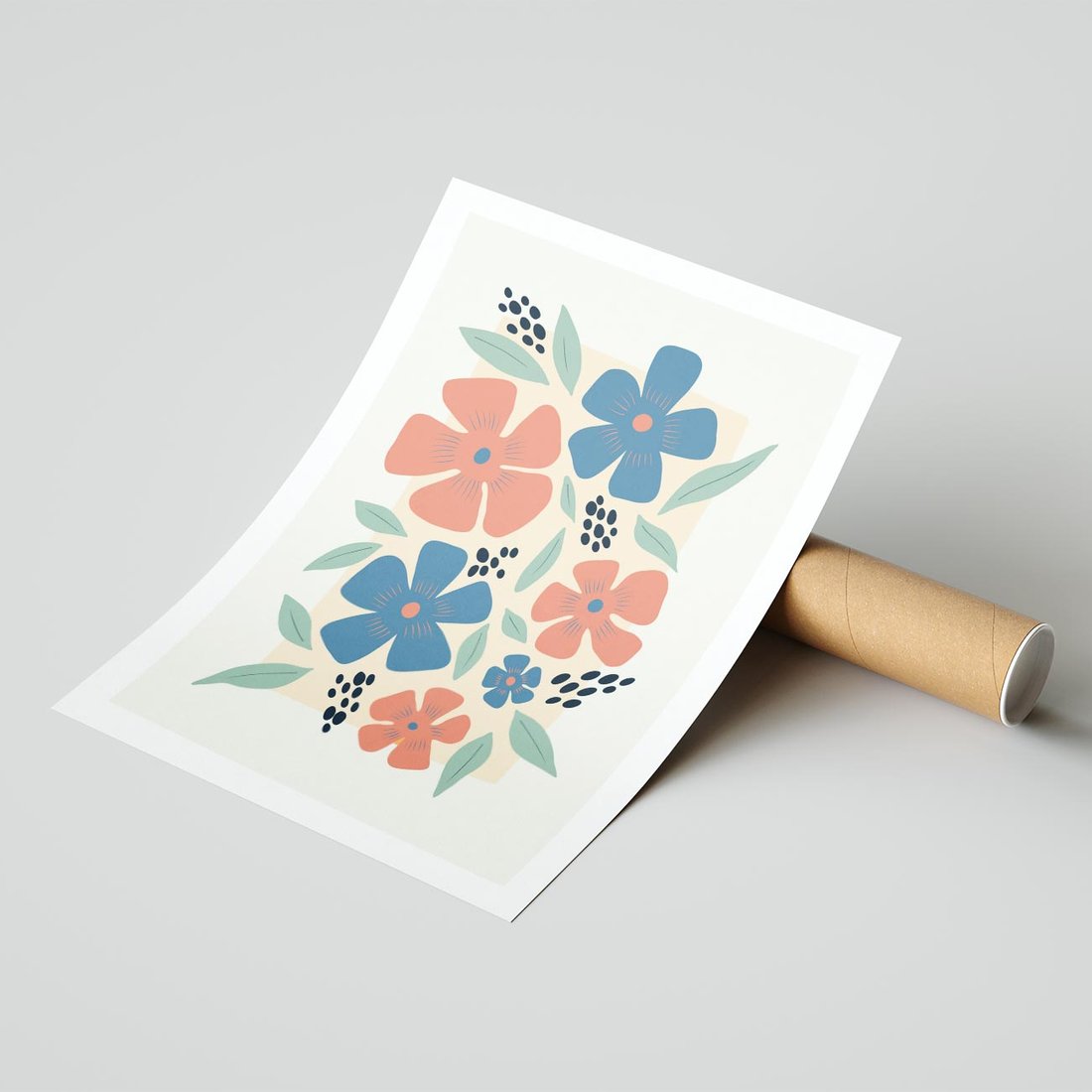Ten minimalistyczny plakat przedstawia pastelowe kwiaty w prostej i harmonijnej kompozycji. To obraz, który emanuje spokojem i subtelnym pięknem natury. Idealny sposób na wprowadzenie delikatnych kwiatowych akcentów do wnętrza, zachowując jednocześnie estetykę minimalistycznego designu.