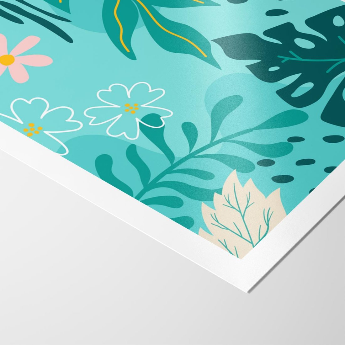 Pastelowa kompozycja z tropikalnymi liśćmi i kwiatami w odcieniach turkusu i różu. To wizualna podróż do tropikalnego raju, dodająca subtelności i koloru Twojej przestrzeni.