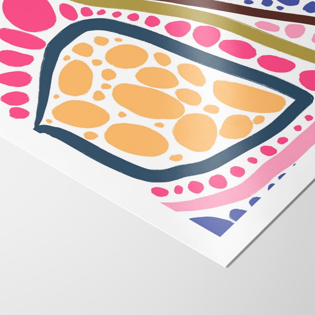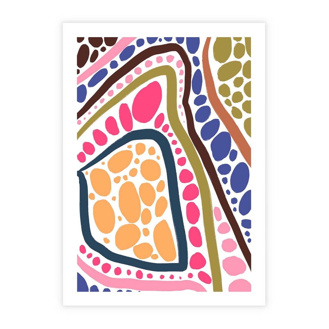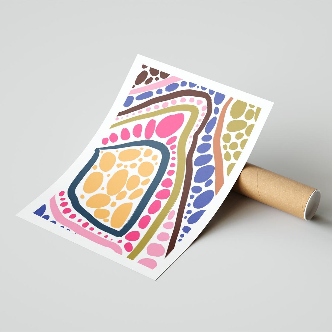 Ten nowoczesny plakat prezentuje kolorowe wzory w tęczowych, żywych kolorach, w formie plam i cipek. To energetyczne i pełne życia połączenie wprowadza do Twojej przestrzeni radość i wyrazistość, tworząc jednocześnie interesujący akcent artystyczny.