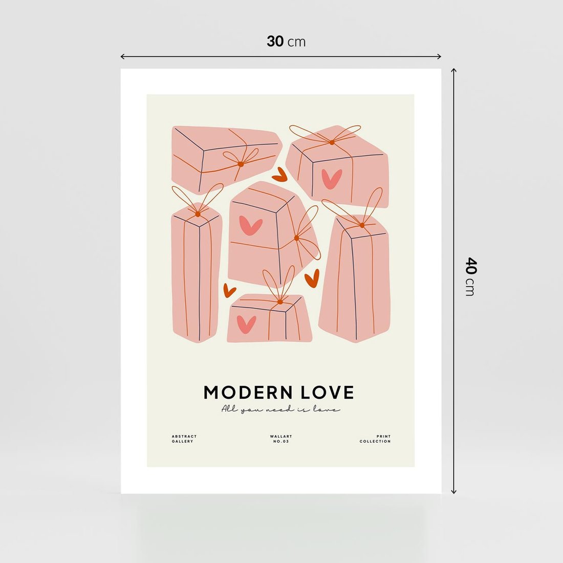 Ta nowoczesna grafika w pastelowych odcieniach ukazuje serduszka i prezenty, tworząc dynamiczną kompozycję. "Nowoczesna Miłość" to hołd dla uczucia w stylu współczesnym, z subtelną typografią "Modern Love". Obraz ten wniesie do wnętrza dawkę radości i romantyzmu, jednocześnie podkreślając nowoczesny charakter miłości.