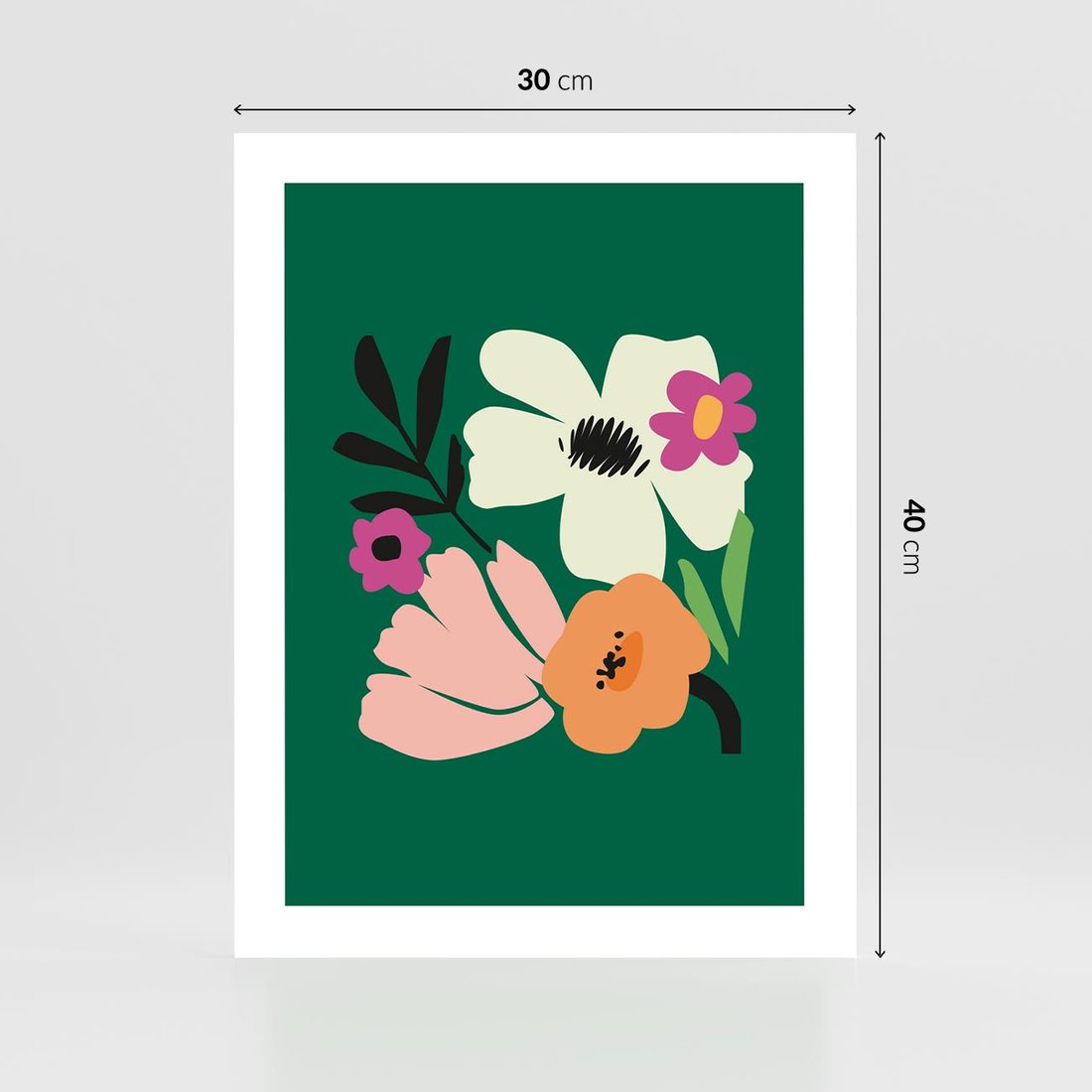 Ten nowoczesny plakat przedstawia abstrakcyjne kwiaty na spokojnym, zielonym tle. Kompozycja ta przynosi do przestrzeni oddech natury w nowatorski i artystyczny sposób, tworząc unikalny punkt centralny w Twoim wnętrzu.