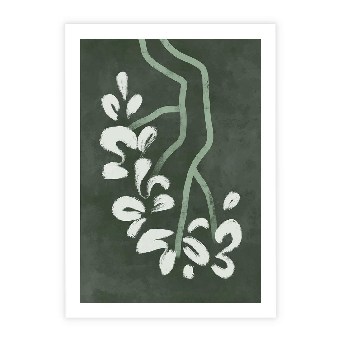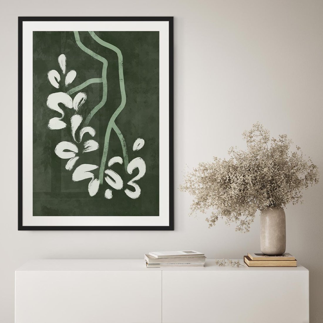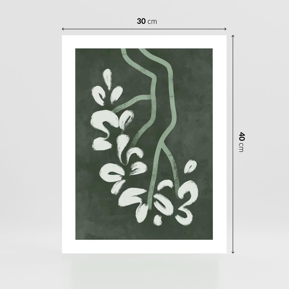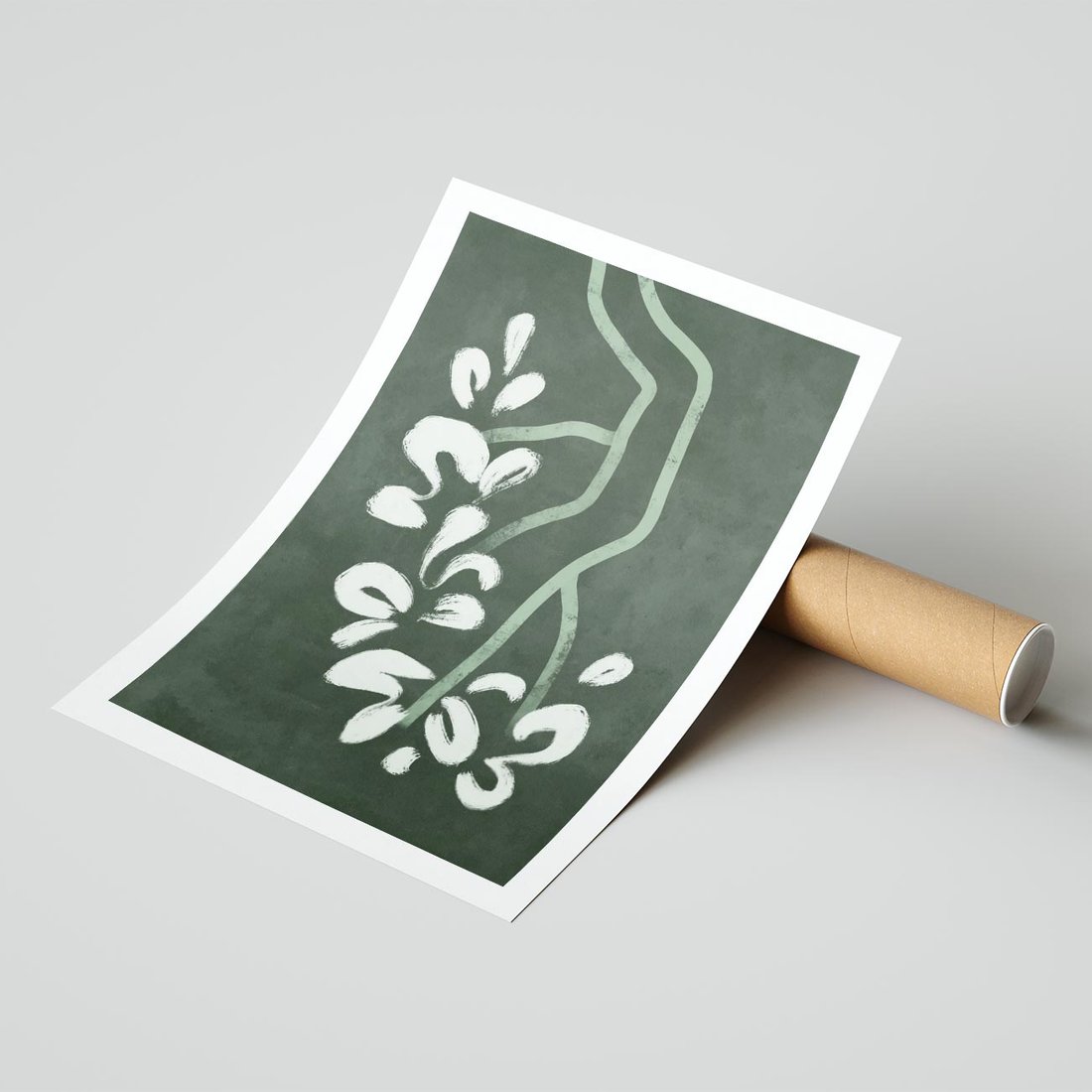 Ten nowoczesny plakat ukazuje abstrakcyjne, delikatne zielone linie przypominające gałęzie kwiatów. To wyjątkowe połączenie natury i nowoczesnej estetyki wprowadza do Twojej przestrzeni subtelność i oryginalność, tworząc jednocześnie interesujący akcent artystyczny.