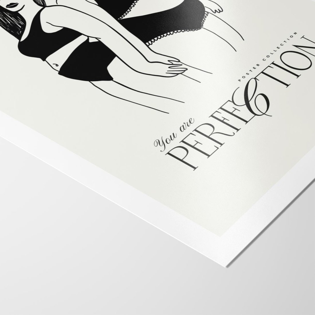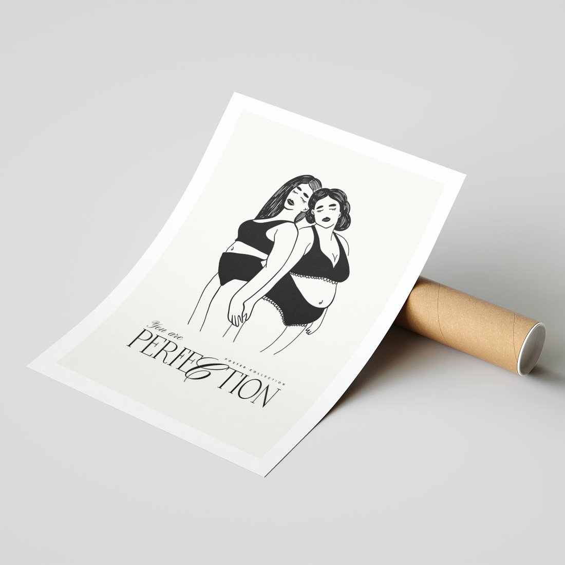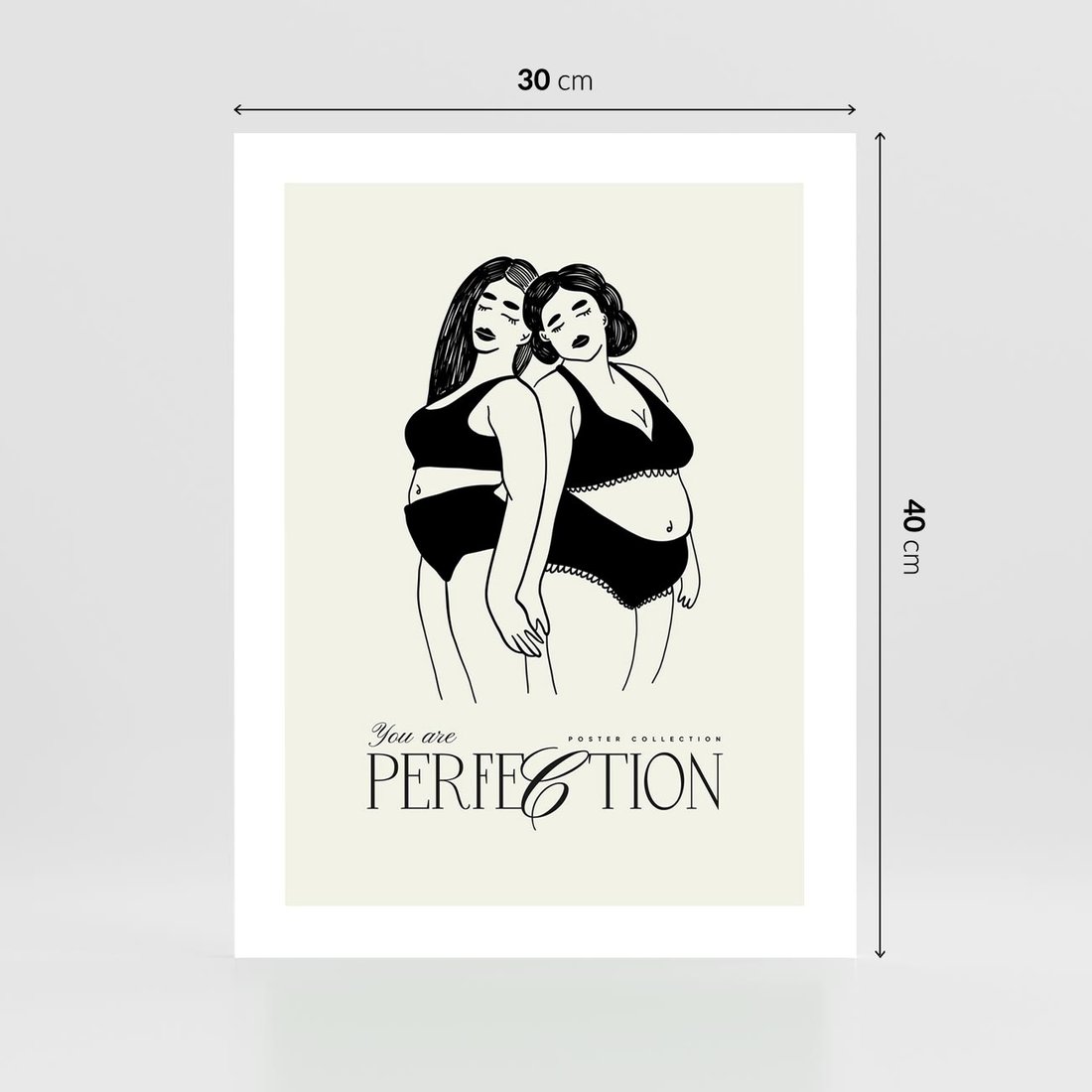 Ten nowoczesny plakat przedstawia dwie kobiety w bieliźnie, promując wartość samoakceptacji. Ich połączenie symbolizuje wspólnotę i siłę kobiecej natury, podkreślanej inspirującą typografią.