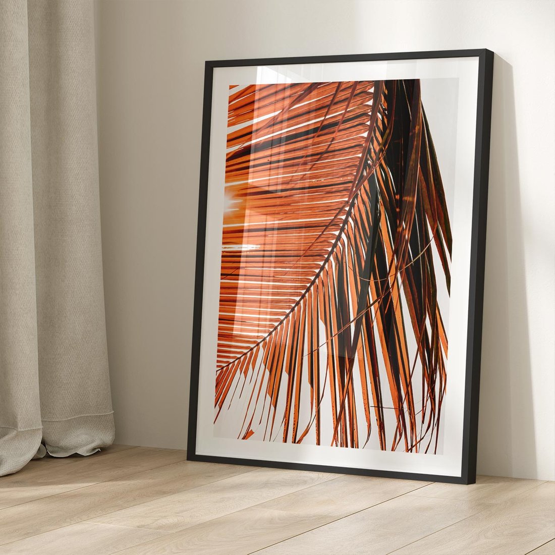 Obraz przedstawia palmę oplecioną promieniami słońca, tworząc ciepłą atmosferę w odcieniach pomarańczu.