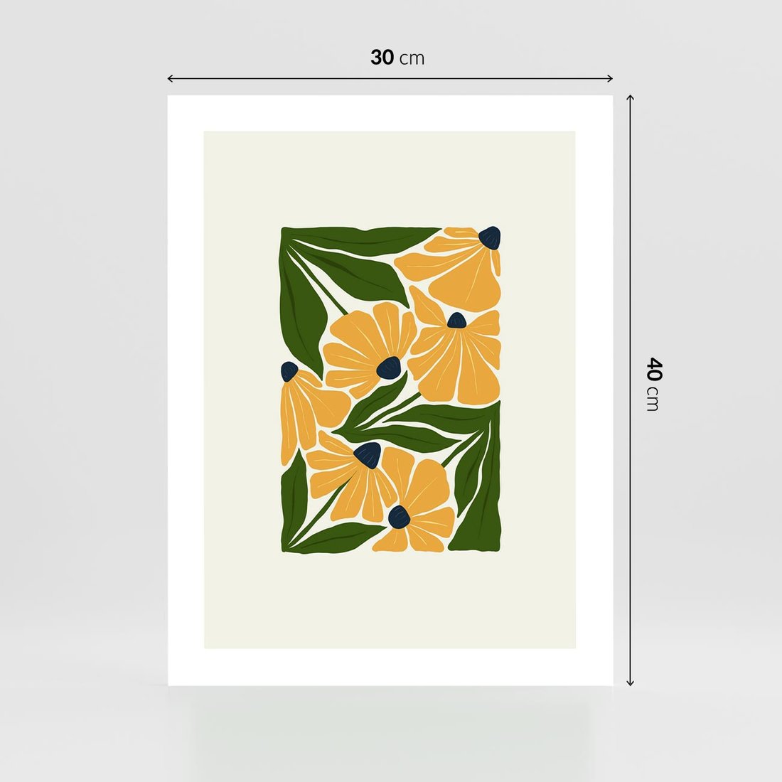 Ta nowoczesna grafika ukazuje żółte kwiaty w harmonijnej kompozycji z zielonymi liśćmi. "Świetliste Kwiaty Natury" to obraz pełen witalności i energii, który przyniesie do wnętrza promieniste odcienie natury. To wyjątkowy sposób na wprowadzenie radosnych akcentów kwiatowych i świeżości do przestrzeni w nowoczesnym stylu.