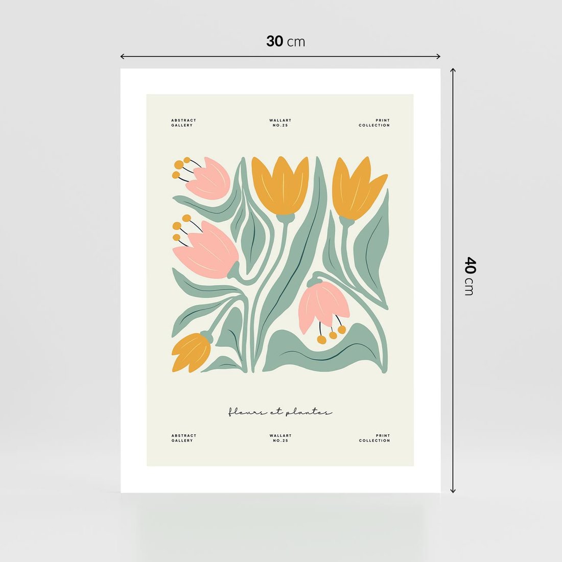 Ten plakat w nowoczesnej abstrakcji przywołuje piękno kwiatów w pastelowych tonach, w harmonii z delikatną typografią. Kompozycja tworzy subtelne i spokojne wrażenie, zachęcając do odkrywania piękna natury.