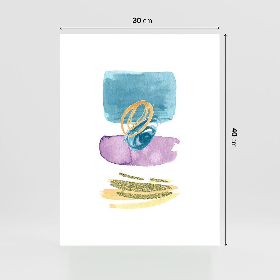 Plakat bez ramy 30x40 - Taniec Akwarelowych Kresek - akwarelowe plamy w odcieniach błękitu, złote kreski