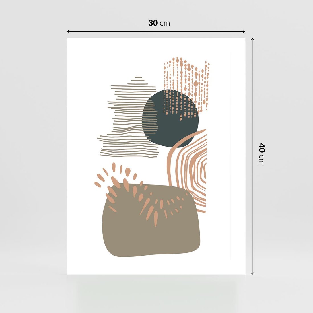 Ta abstrakcyjna kompozycja składa się z delikatnych kropek, kresek i kółek w spokojnych odcieniach brązu i beżu. Jej minimalistyczny charakter przynosi uczucie harmonii i spokoju, doskonale pasując do każdego wnętrza.