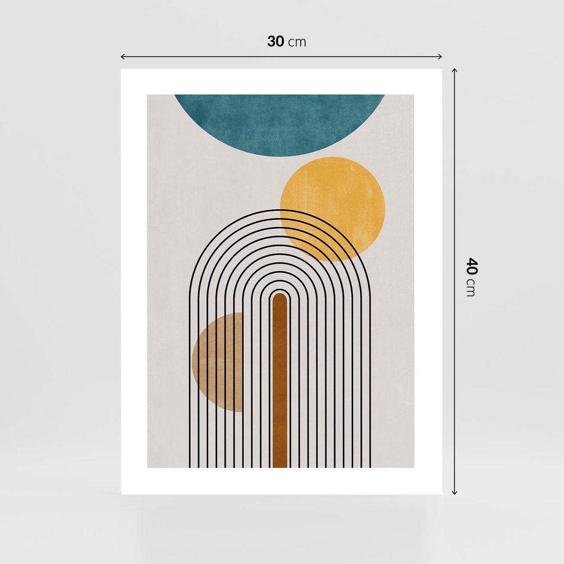 Ten plakat w stylu mid century łączy nowoczesną sztukę z regularnymi liniami i okręgami, tworząc harmonijną kompozycję, która idealnie pasuje do współczesnych wnętrz.