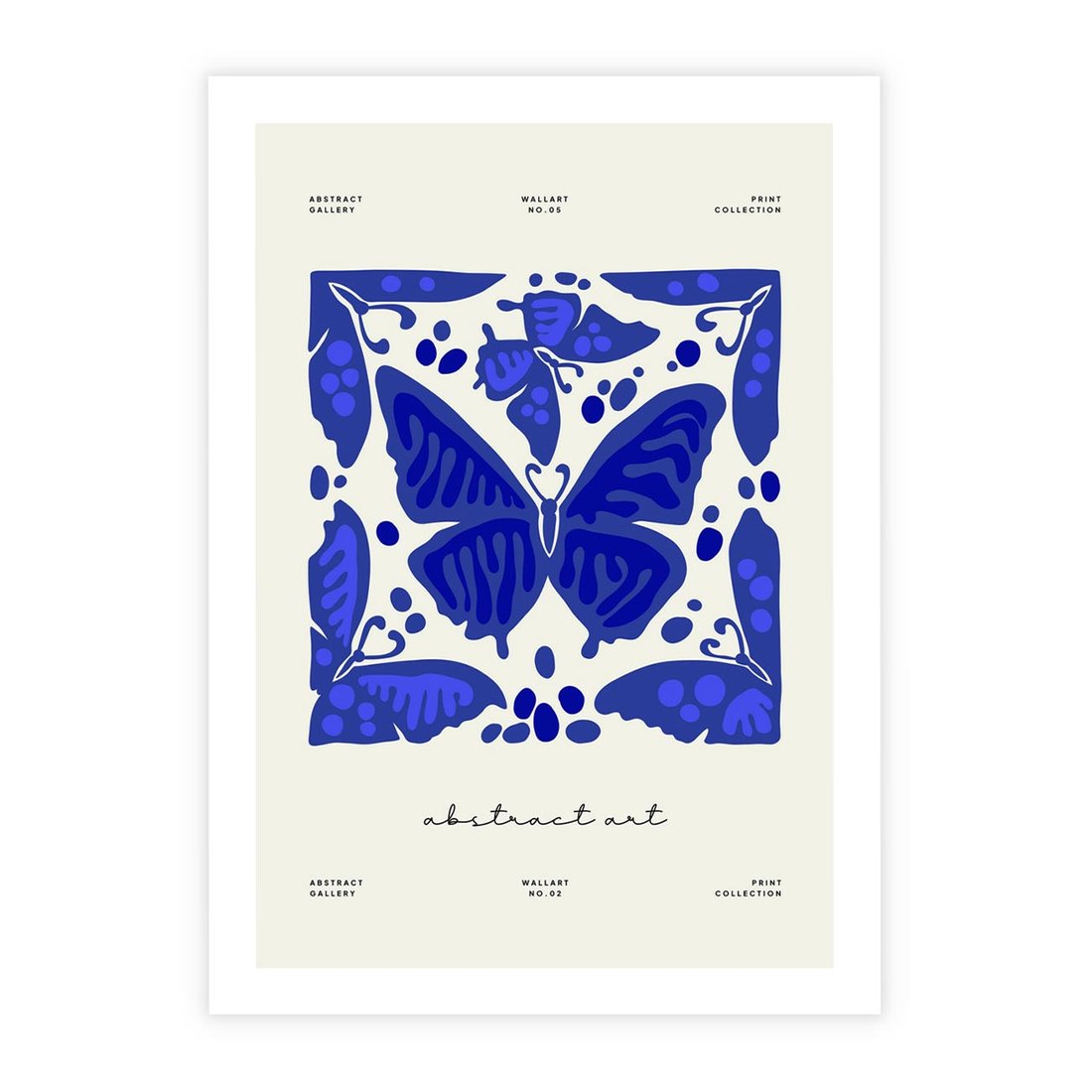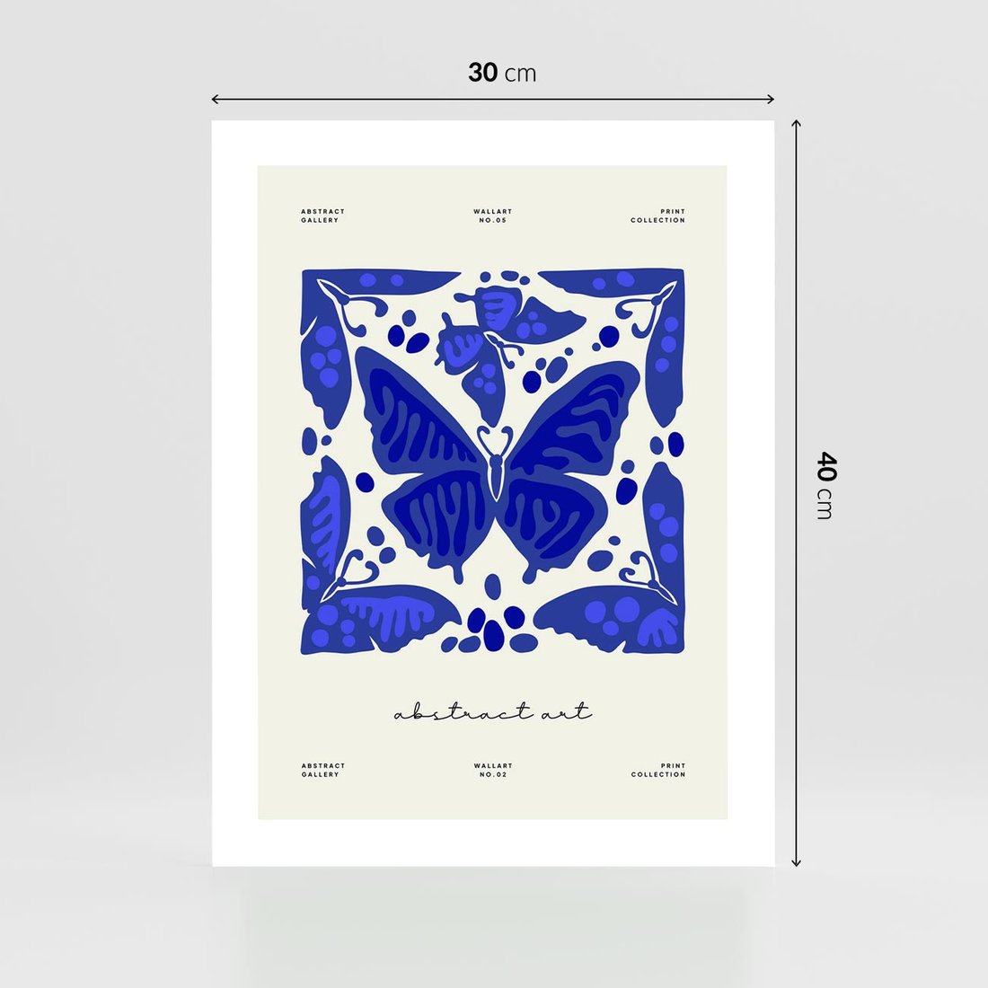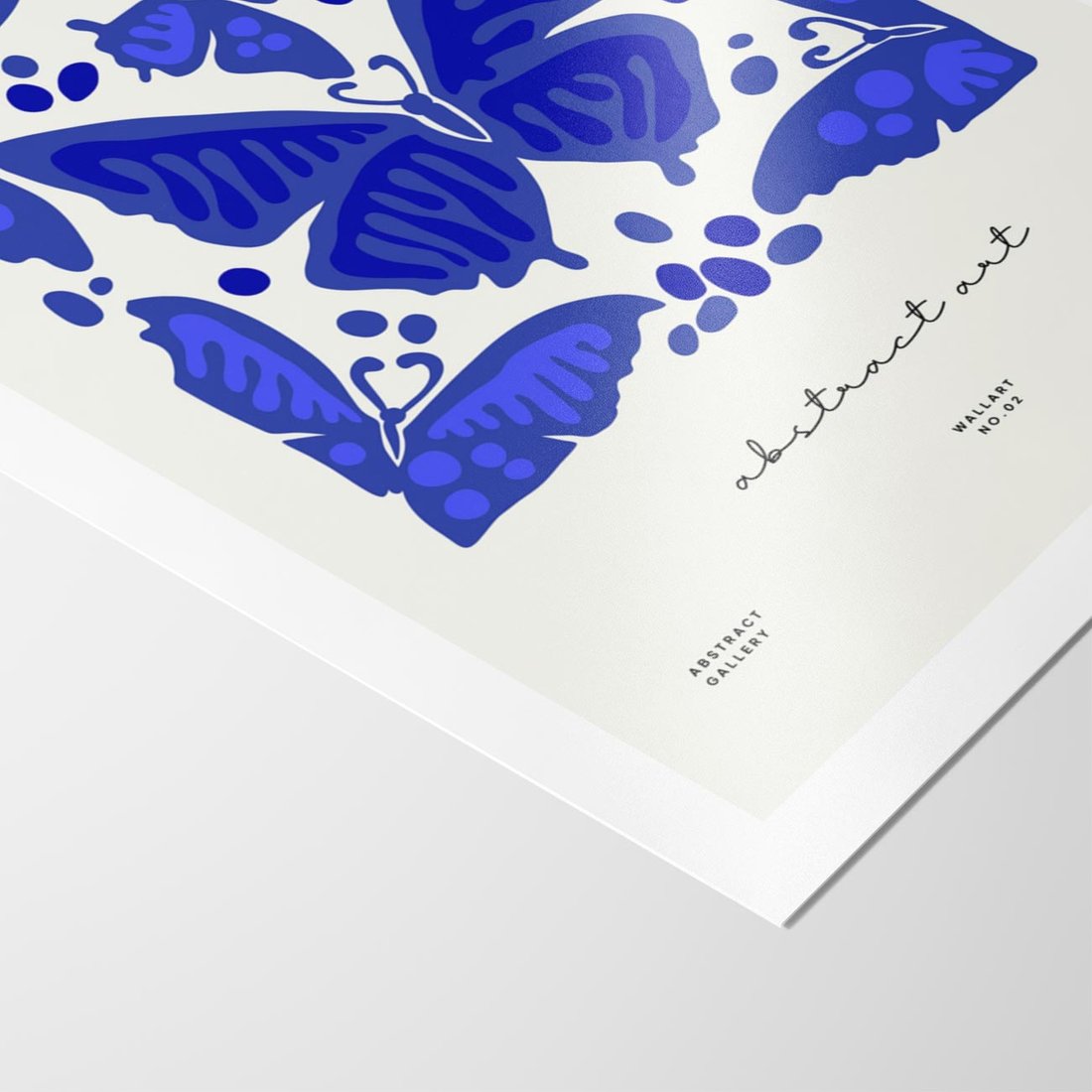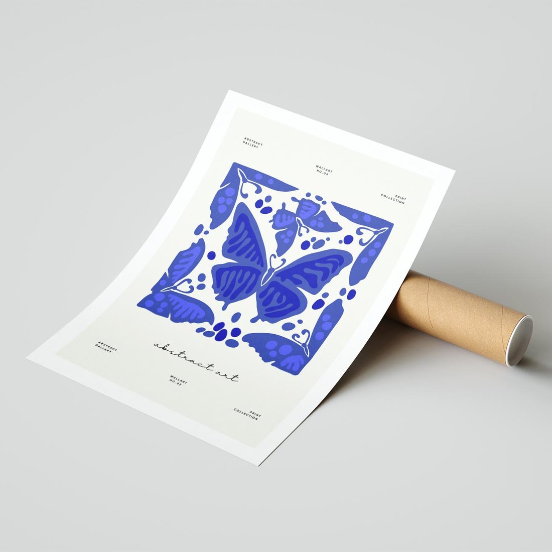 Ten nowoczesny plakat w odcieniach błękitu przedstawia abstrakcyjne motyle, tworząc hipnotyzującą kompozycję. Delikatność motywów kontrastuje z nowoczesnym stylem, tworząc unikalne wrażenie.