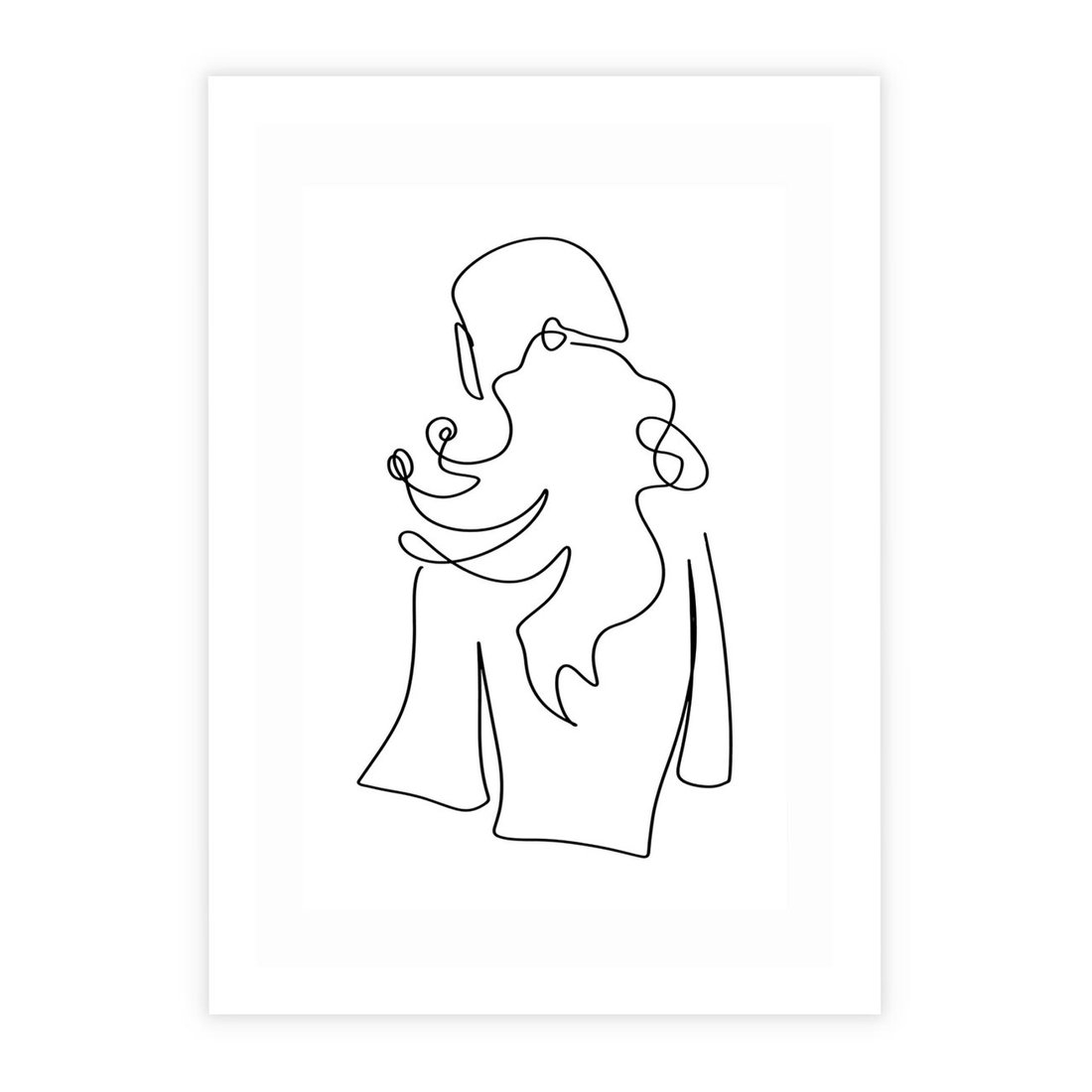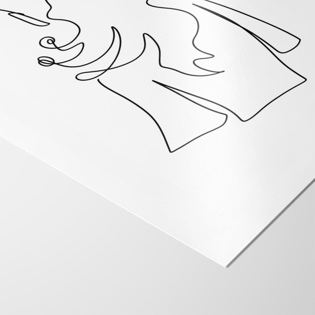 Minimalistyczny plakat przedstawiający szkic kobiety wykonany jedną ciągłą linią. Wyrazisty w swoim minimalizmie, podkreślając piękno prostoty, na neutralnym białym tle.