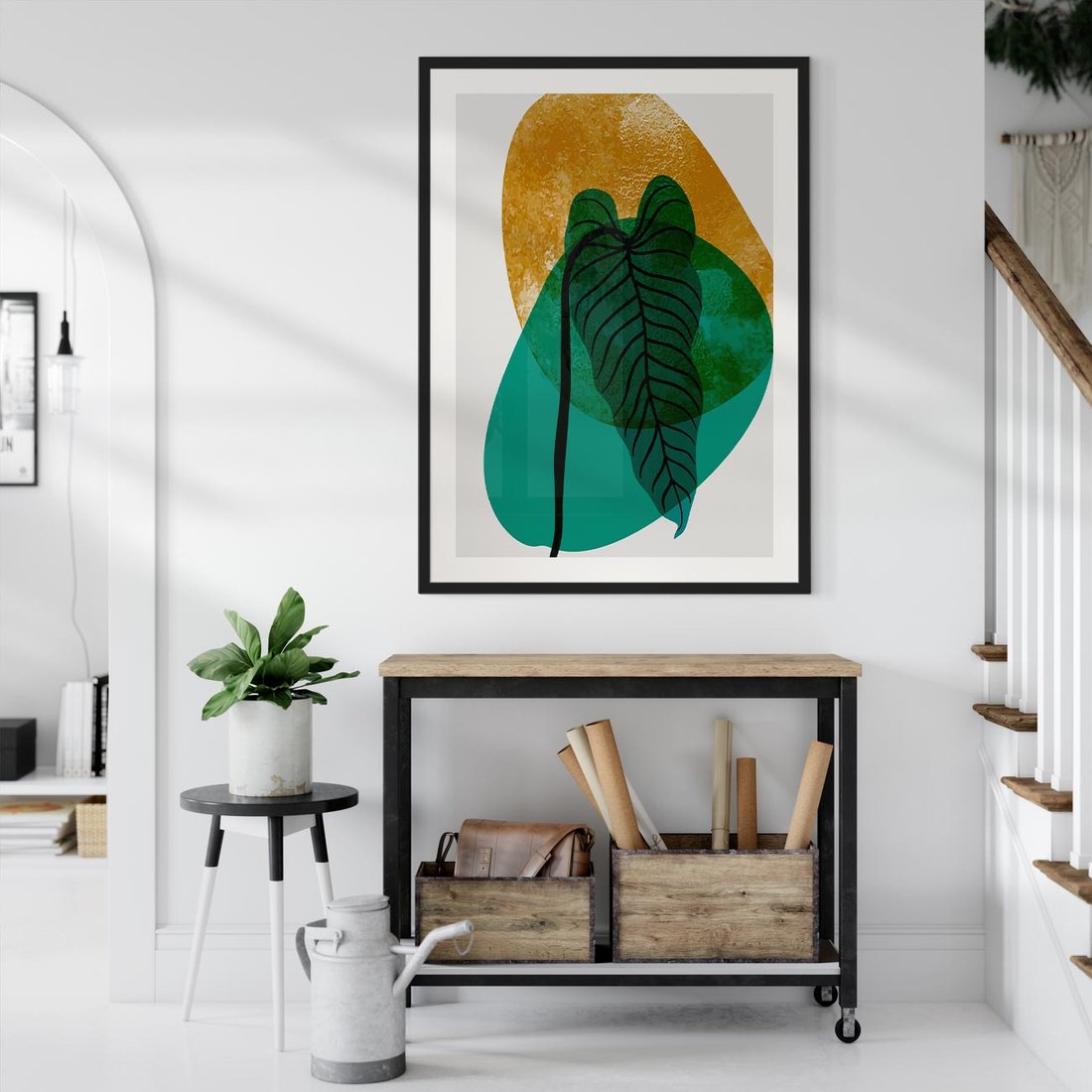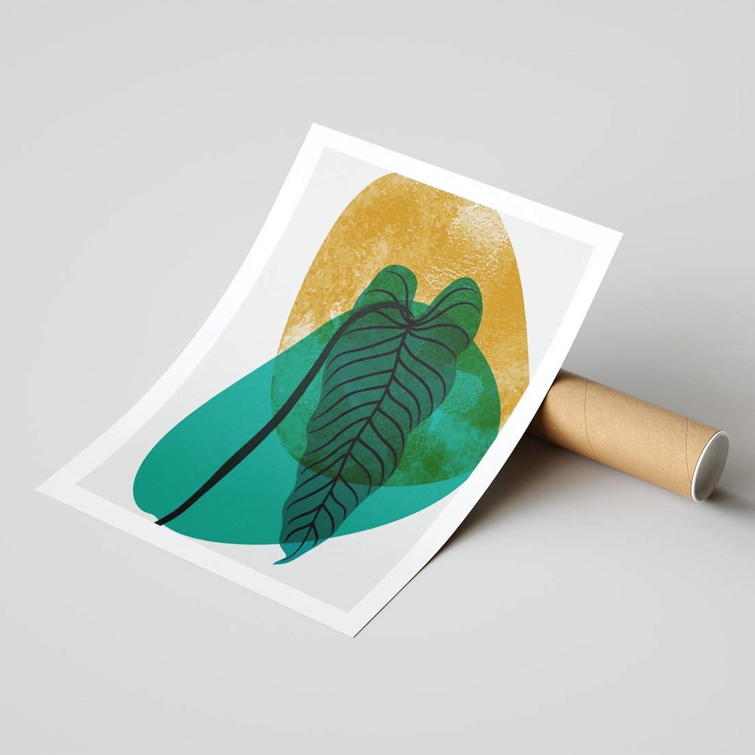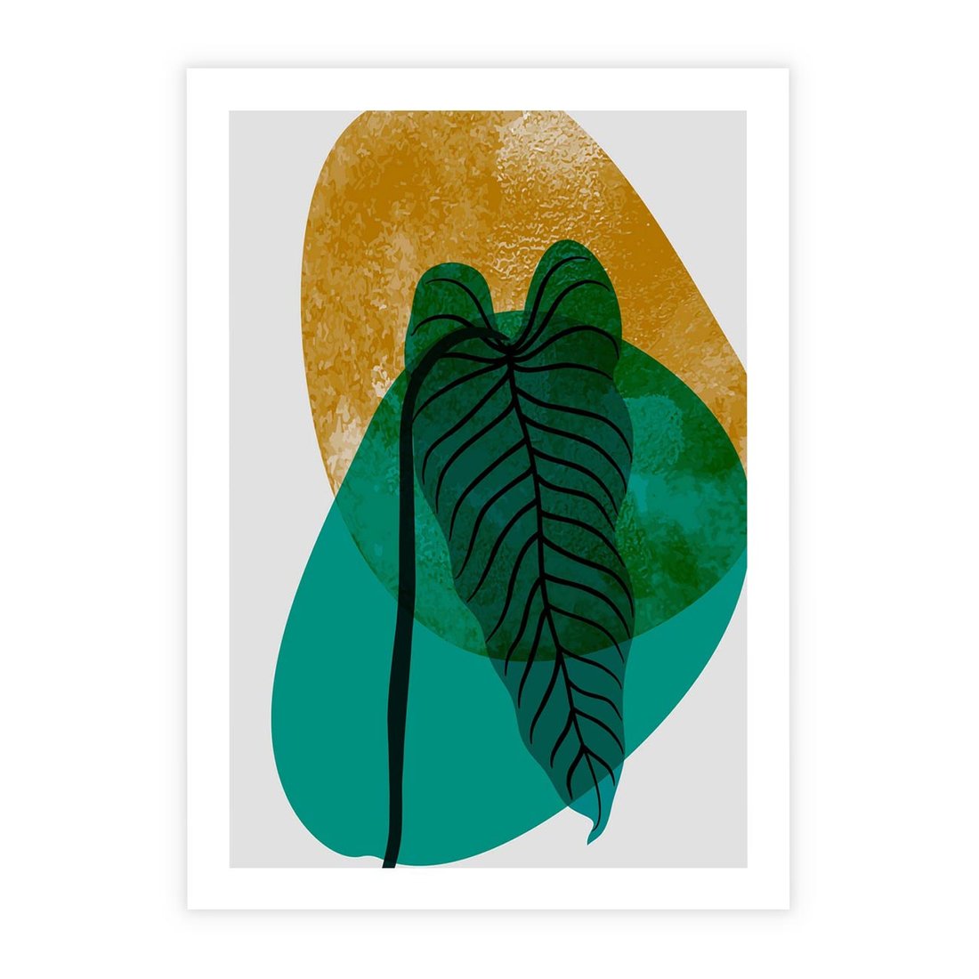 Obraz przedstawia grafikę z zielonym liściem i złotą plamą, tworząc elegancką i harmonijną kompozycję.