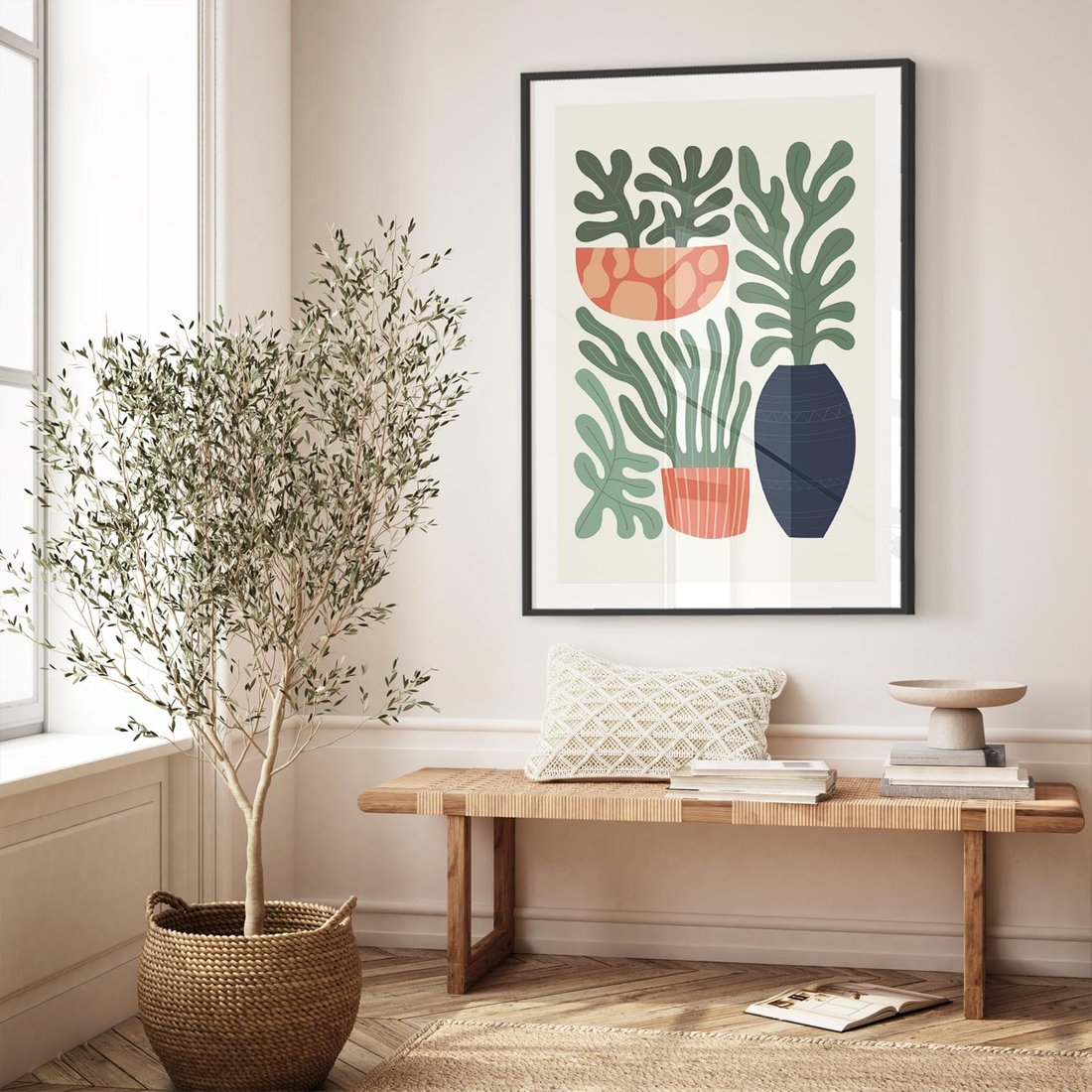 Obraz przedstawia nowoczesną grafikę z abstrakcyjnymi elementami i motywem roślinnym. Ta kompozycja artystyczna doskonale wpasowuje się w nowoczesne wnętrza, dodając im wyjątkowej estetyki i kreatywnego uroku.