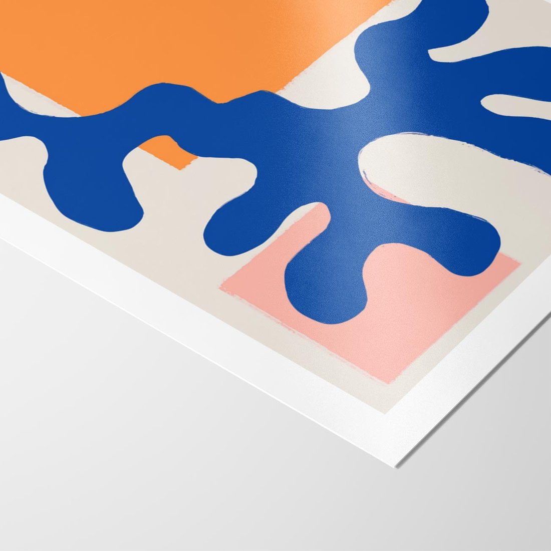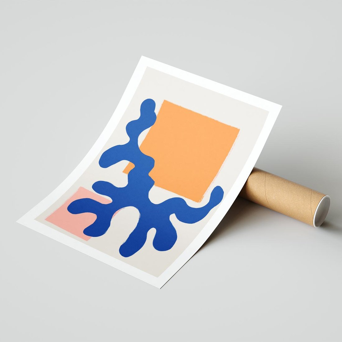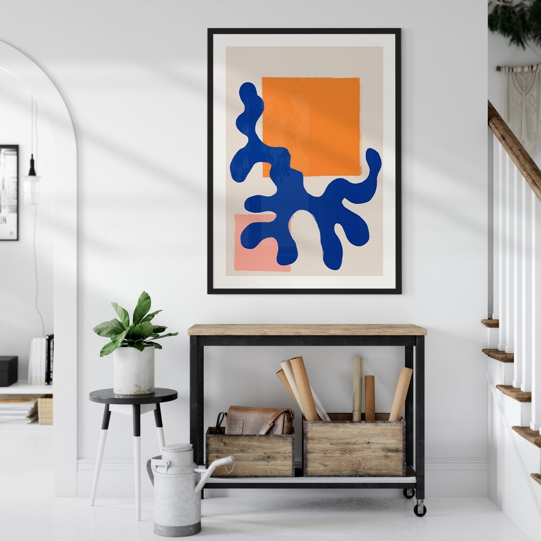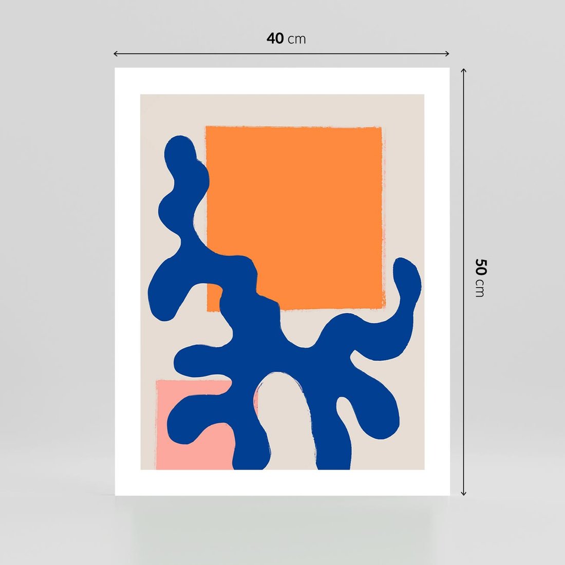Ten nowoczesny plakat prezentuje abstrakcyjne geometryczne kształty w intensywnych kolorach pomarańczowym i granatowym. To dzieło sztuki wnosi do Twojej przestrzeni nowoczesny charakter i ekspresyjność. Idealny wybór dla tych, którzy cenią sobie sztukę abstrakcyjną i dynamiczne kompozycje kolorystyczne.