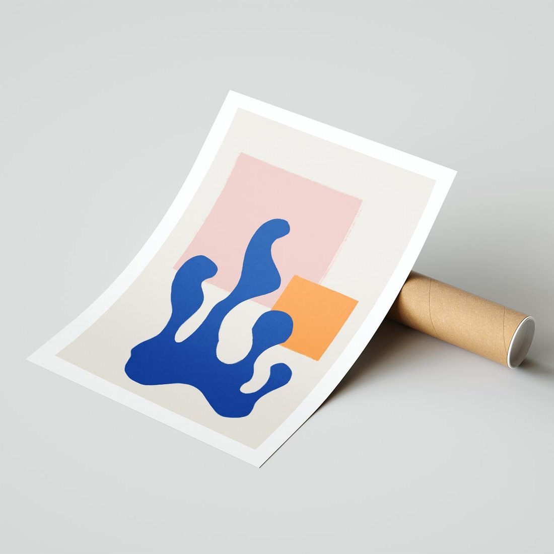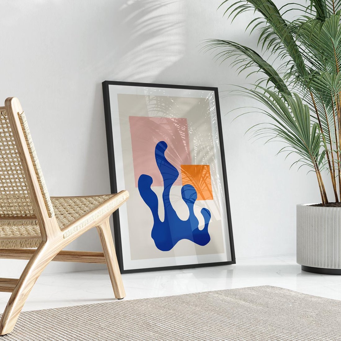 Ten nowoczesny plakat jest prawdziwym dziełem abstrakcyjnej sztuki, w którym dominują geometryczne kształty w intensywnych kolorach: pomarańczowym i granatowym. To dzieło łączy w sobie nowoczesność z abstrakcją, tworząc efektowną i energetyczną kompozycję. Idealny wybór dla miłośników sztuki nowoczesnej i wyrazistych wzorów.