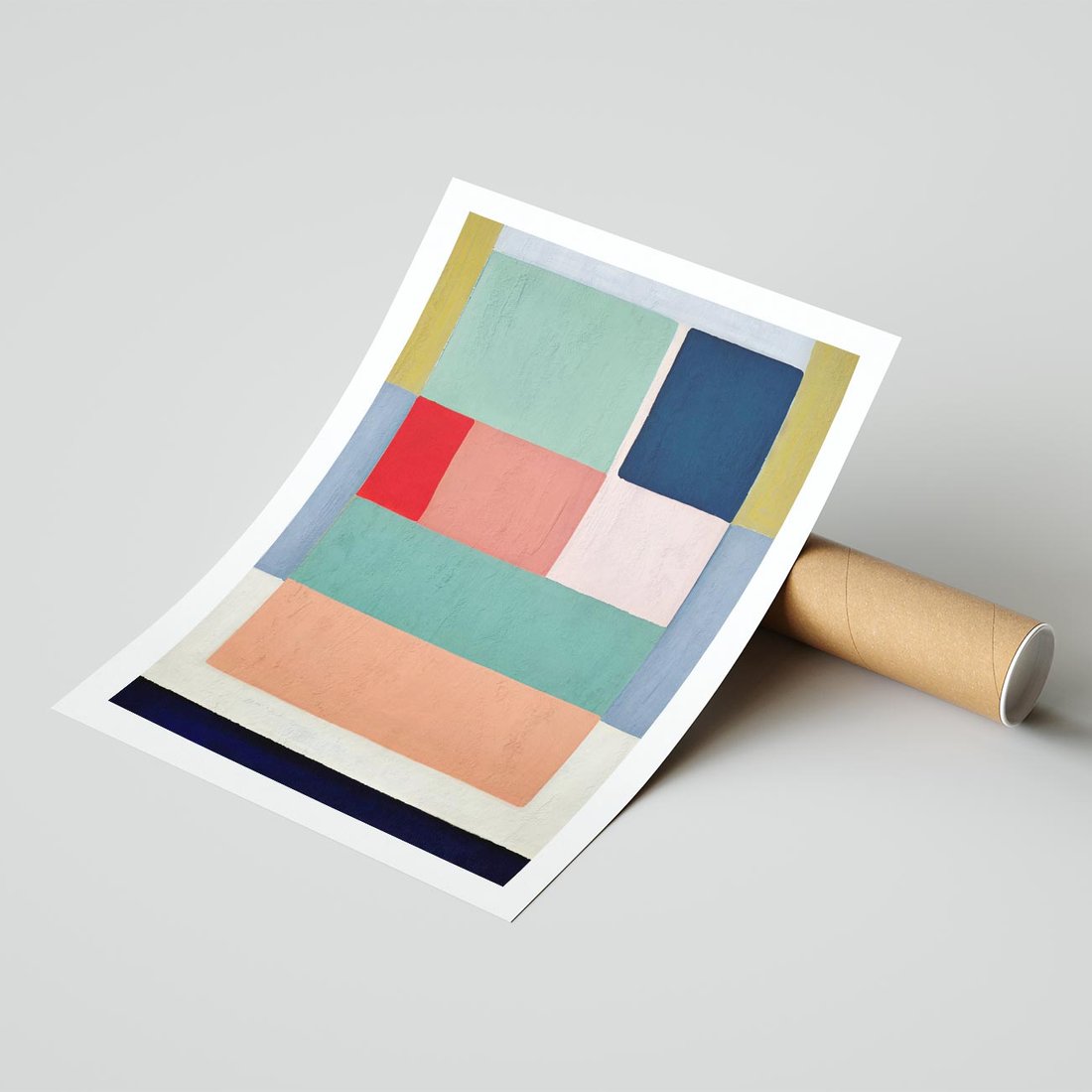 To olejny obraz o abstrakcyjnych geometrycznych kształtach, w których dominują pastelowe kolory. Prostokąty i kwadraty tworzą harmonijną kompozycję, która zachwyca swoją subtelnością i równowagą.