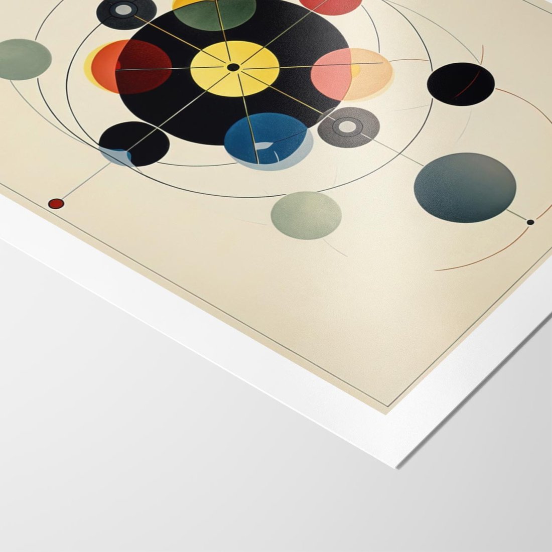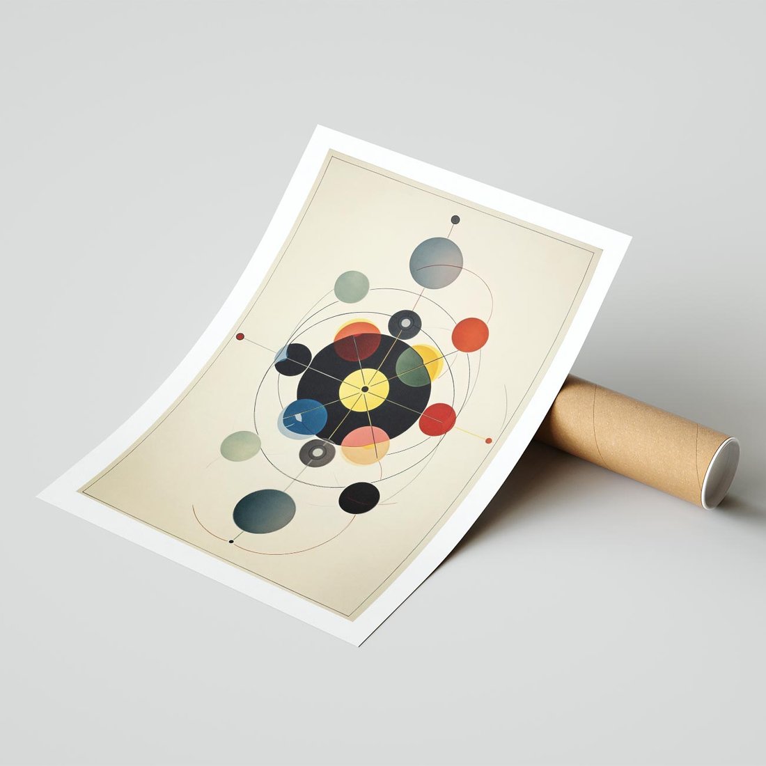 Ta abstrakcyjna geometryczna kompozycja zachwyca wyrazistymi kołami, dynamicznymi liniami i żywymi kolorami, nawiązującymi do charakterystycznego stylu Wassily'ego Kandinsky'ego. To wizualna podróż w świat abstrakcji i emocji.