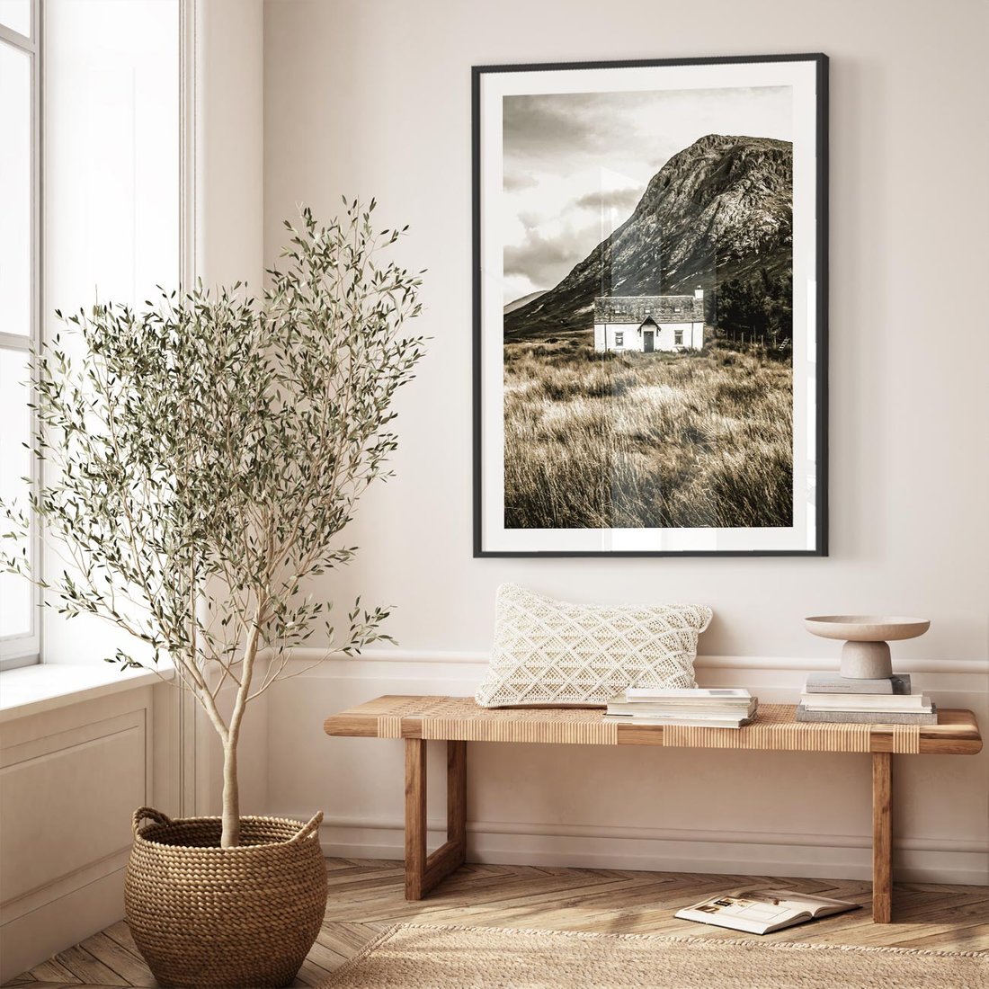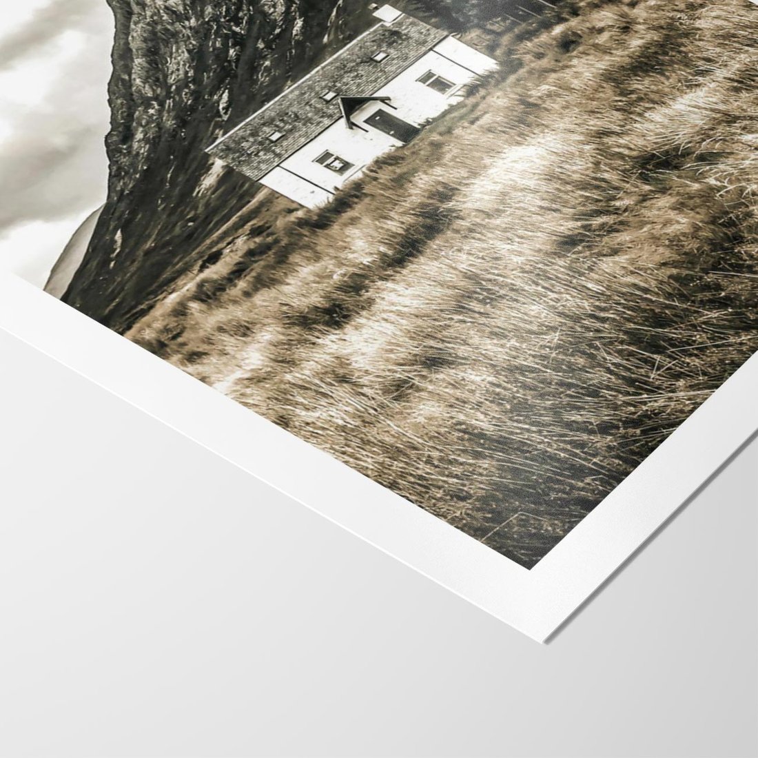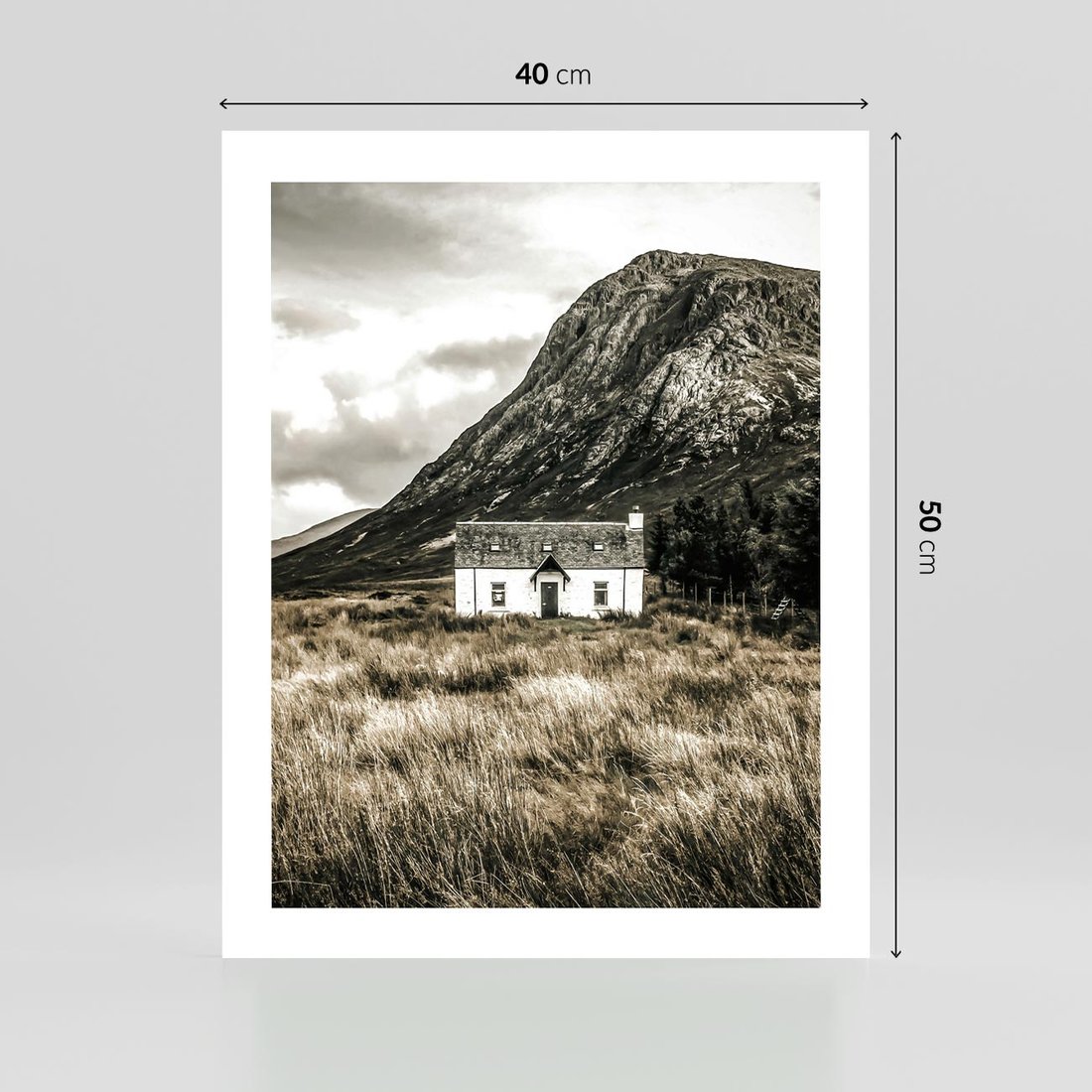 Plakat bez ramy 40x50 - Biały Domek w Sepii: Wiejski Urok - domek w górach, kolory sepii