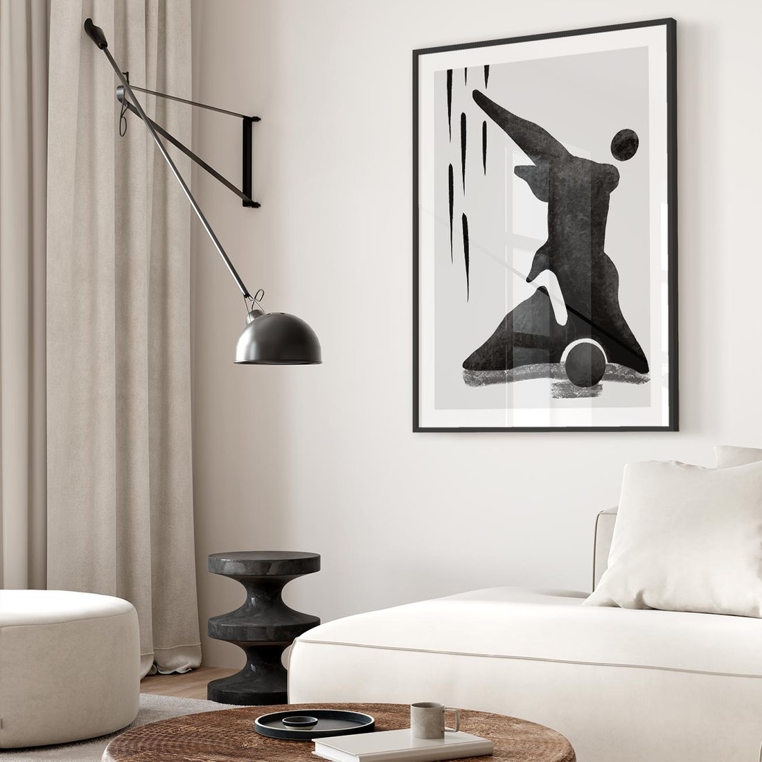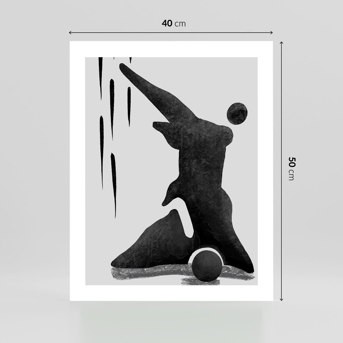 To nowoczesna grafika w czarno-białym stylu, przedstawiająca abstrakcyjną postać. Plakat ten łączy w sobie nowatorski design z minimalistycznym podejściem.