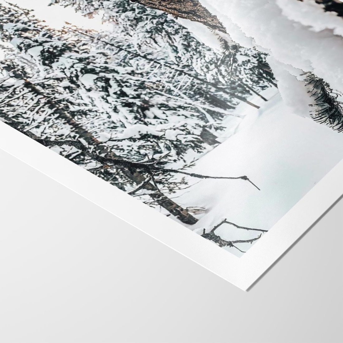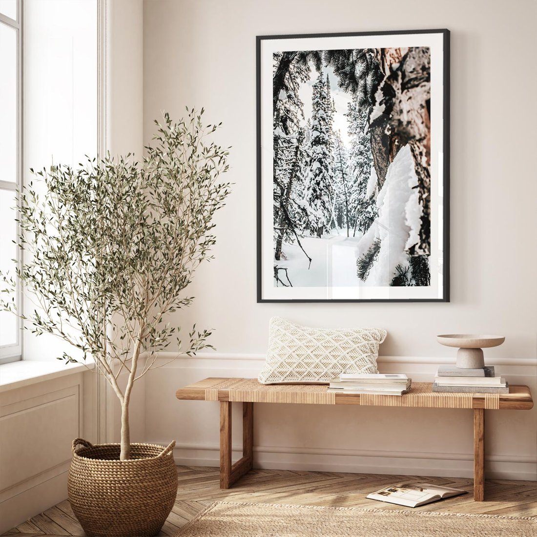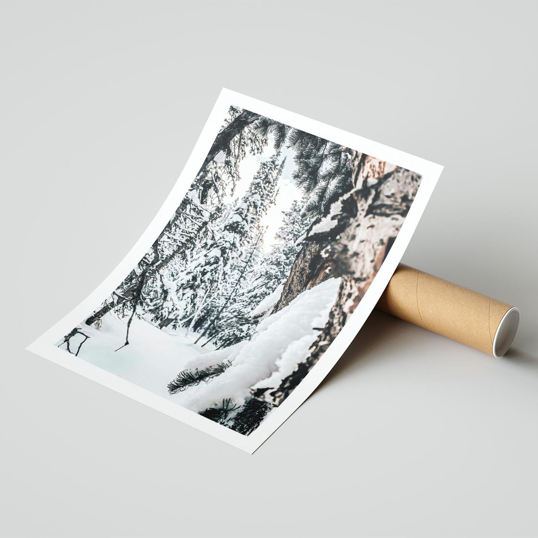 To ujęcie zimowego lasu, gdzie drzewa pokryte są warstwą śniegu, tworząc malowniczy i spokojny krajobraz zimowy. Obraz doskonale pasuje do wnętrz utrzymanych w stylu skandynawskim lub rustykalnym, nadając im atmosferę spokoju i uroku natury.