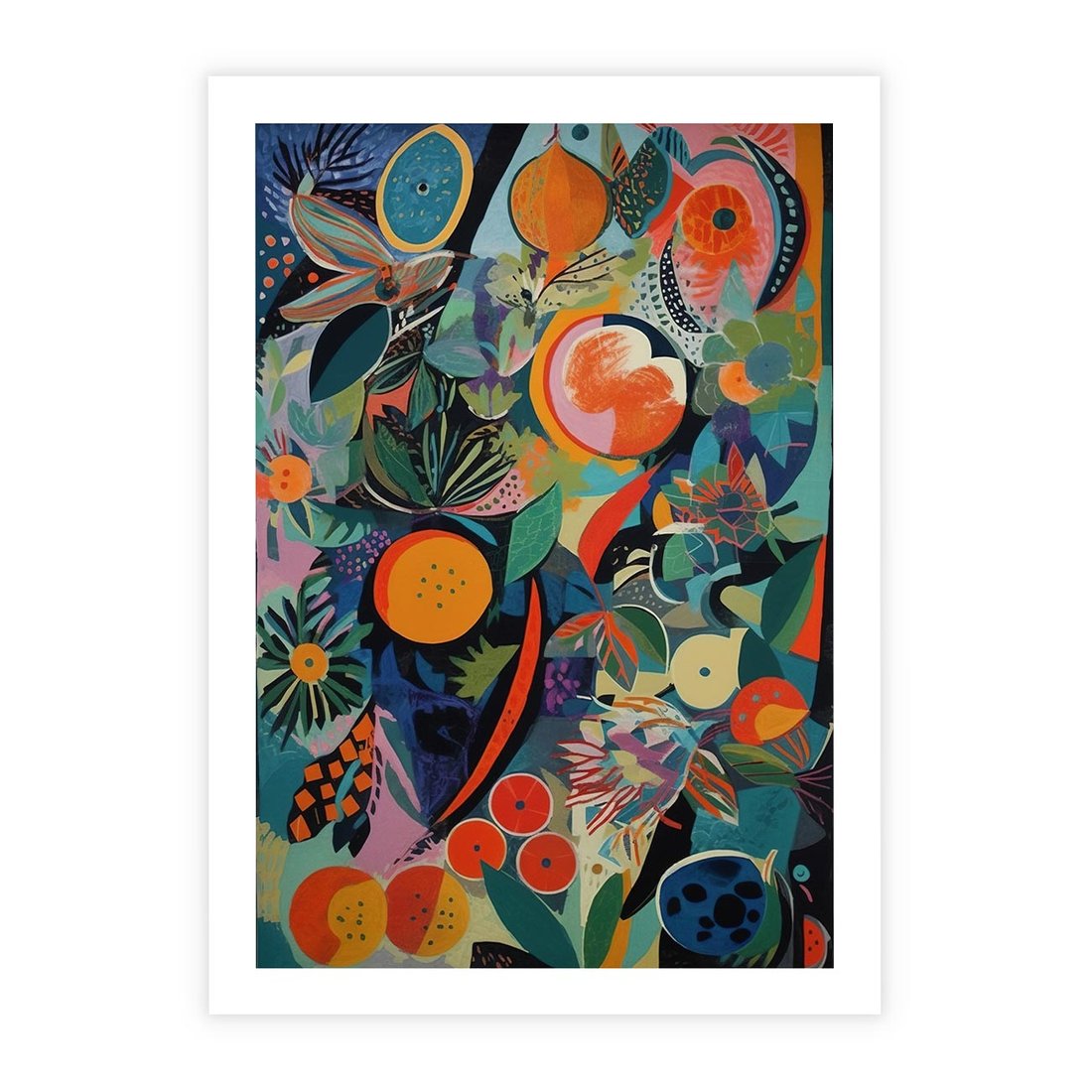 Ten abstrakcyjny obraz olejny, nawiązujący do stylu Picassa, eksploruje bogactwo kolorów i form owoców. Żywe barwy oraz swobodne linie tworzą dynamiczną kompozycję, oddającą radość i energię natury.