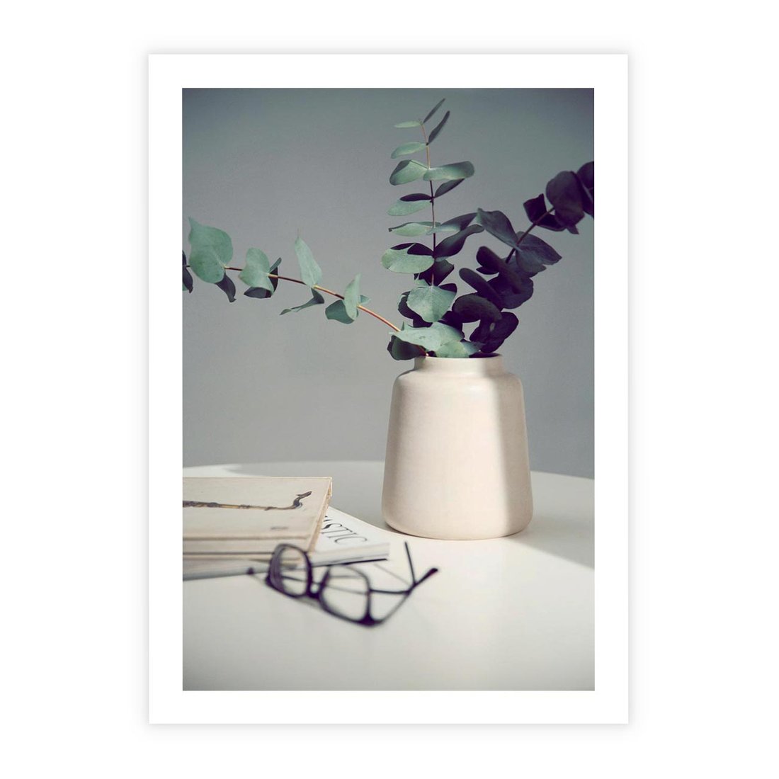 Obraz przedstawia kompozycję z liści eukaliptusa w wazonie, gazetą i okularami. Ta aranżacja oddaje atmosferę relaksu i czytania w spokojnym otoczeniu, doskonale pasując do wnętrz, które pragną wyrazić harmonię i spokój.