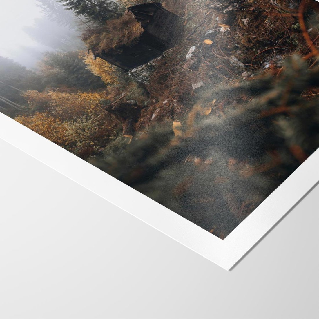 Plakat bez ramy 40x50 - Górski las - stary zniszczony domek w górach, góry