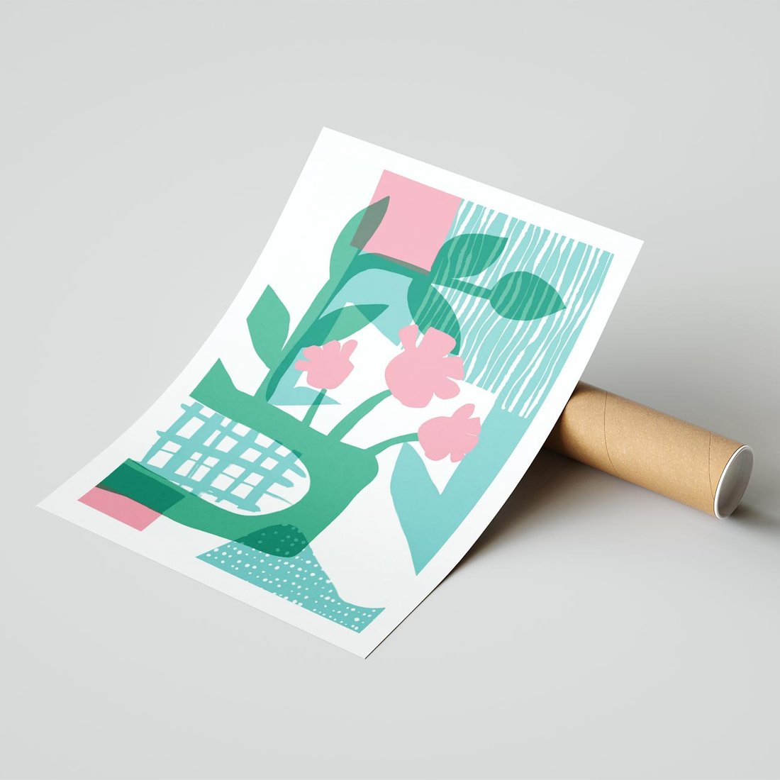 Nowoczesna sztuka w postaci abstrakcyjnych, pastelowych kwiatów o delikatnych odcieniach zieleni i różu, tworzących unikalną kompozycję.