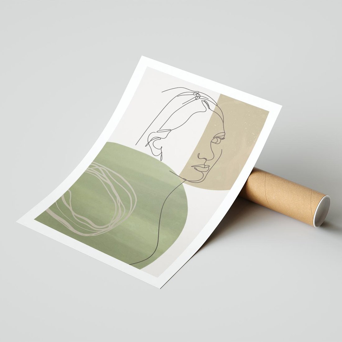 Plakat bez ramy 40x50 - Jedna Linia, Wiele Emocji - akwarelowe plamy, na nich szkic postaci kobiety jedną linią