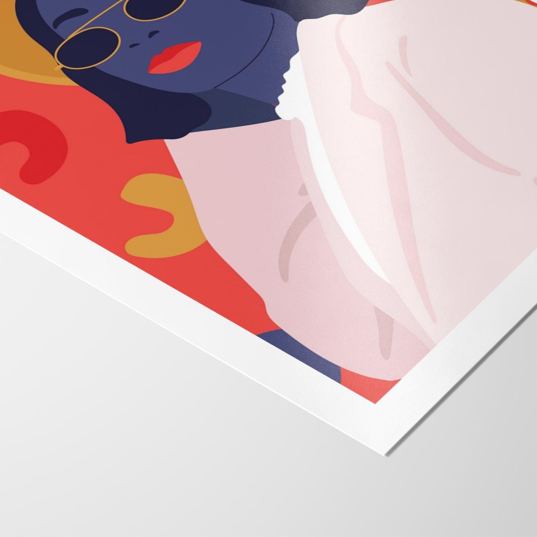 Nowoczesny plakat w stylu retro przedstawia kobietę w okularach słonecznych. Żywe kolory podkreślają jej styl i wyjątkowość, tworząc dynamiczną kompozycję pełną energii i osobowości.