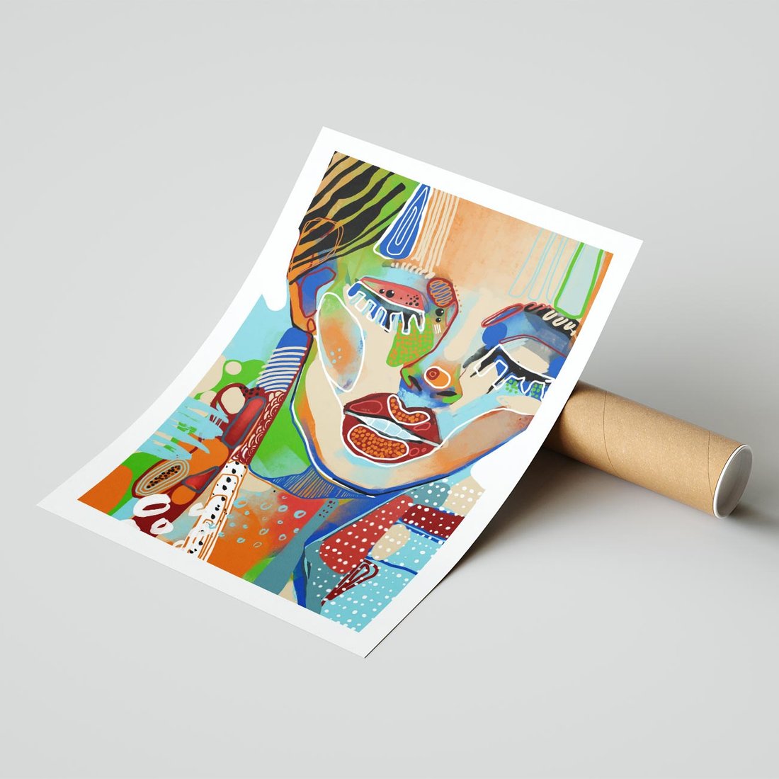 Abstrakcyjny portret kobiety emanuje ekspresją poprzez żywe kolory i wyrazistą twarz. Zamknięte oczy dodają tajemniczości, tworząc unikalną i fascynującą kompozycję.