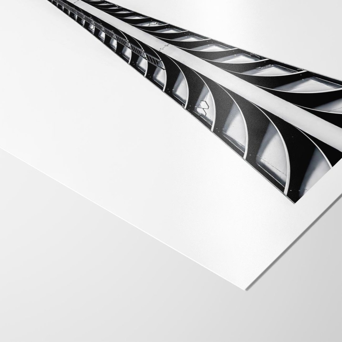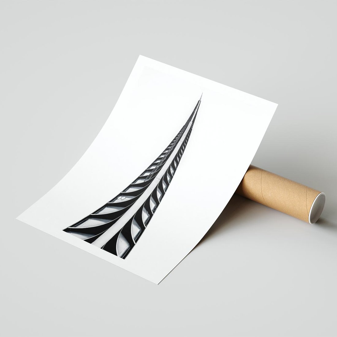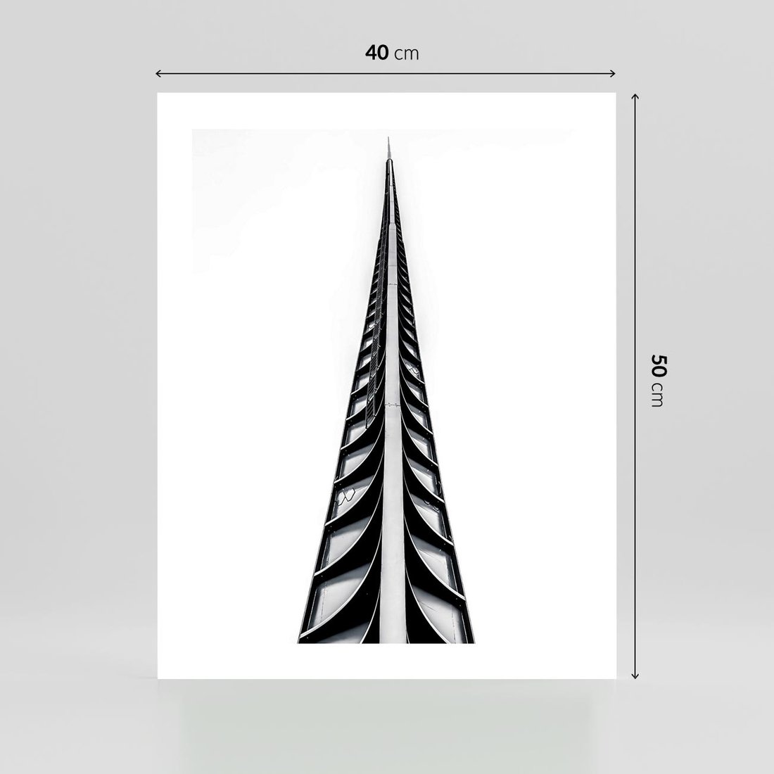 Obraz przedstawia majestatyczny, wysoki wieżowiec uwieczniony na czarno-białej fotografii. Ta fotograficzna kompozycja doskonale pasuje do nowoczesnych i minimalistycznych wnętrz, dodając im elegancji i surowego uroku.