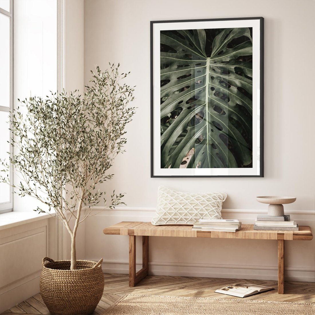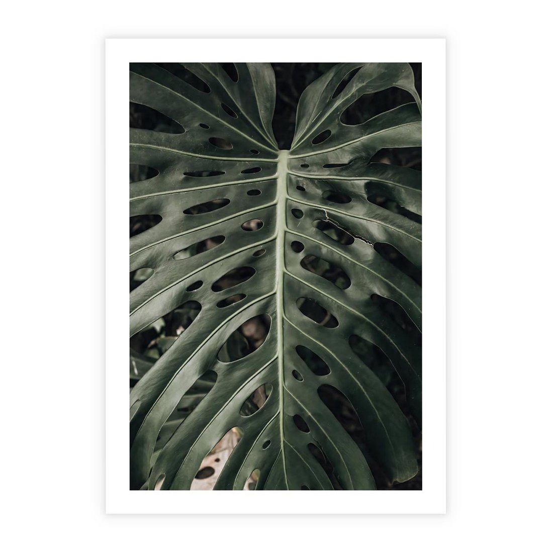 Obraz przedstawia majestatyczny liść monstery o ciemnej zieleni, który emanuje elegancją i urodą.