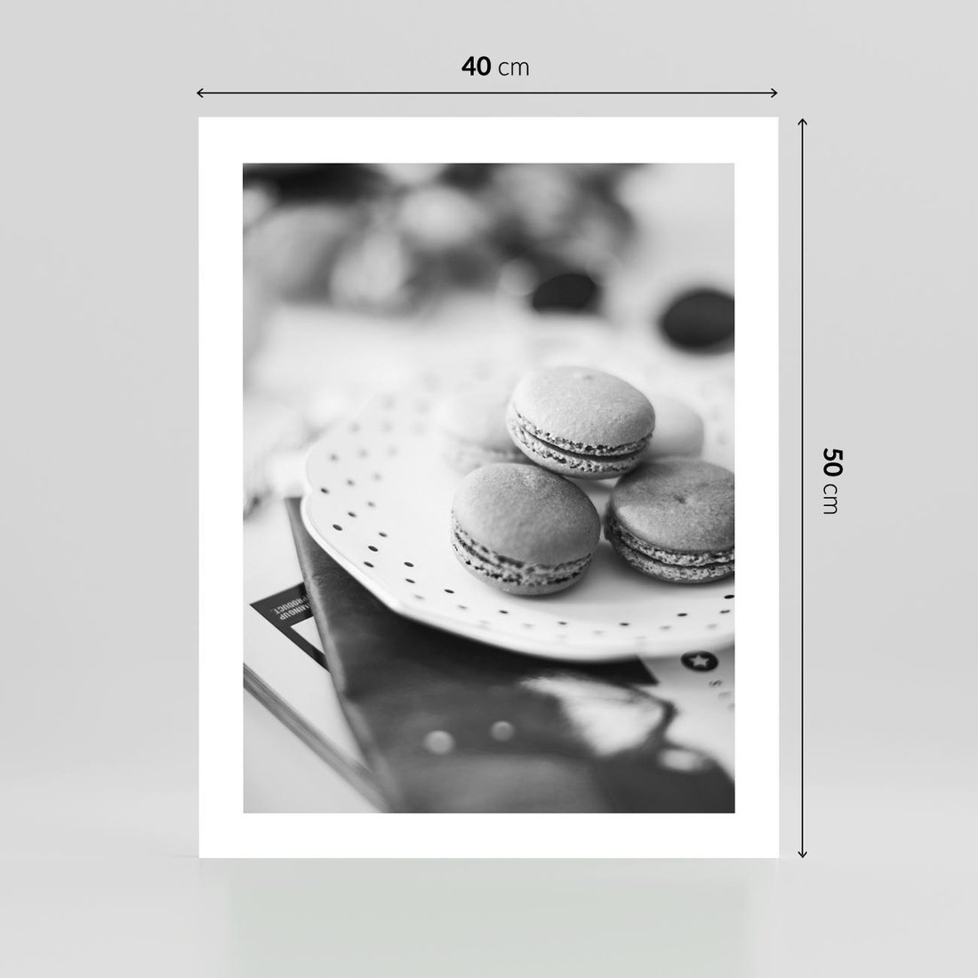 Ta czarno-biała fotografia jest artystycznym zbliżeniem ciasteczek makaronik na talerzu. Zdjęcie oddaje teksturę i szczegóły tych smakowitych wypieków w sposób elegancki i klasyczny. Czarno-biała paleta kolorów nadaje fotografii wyrafinowanego wyglądu i podkreśla estetykę tych delikatnych słodkości. To doskonały plakat do nowoczesnych wnętrz, które cenią sobie sztukę w fotografii żywności i estetykę kulinarnej przyjemności.