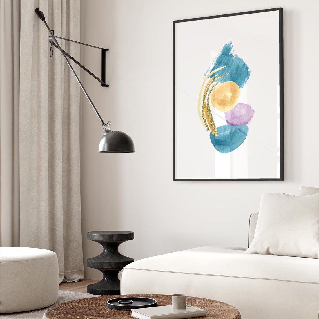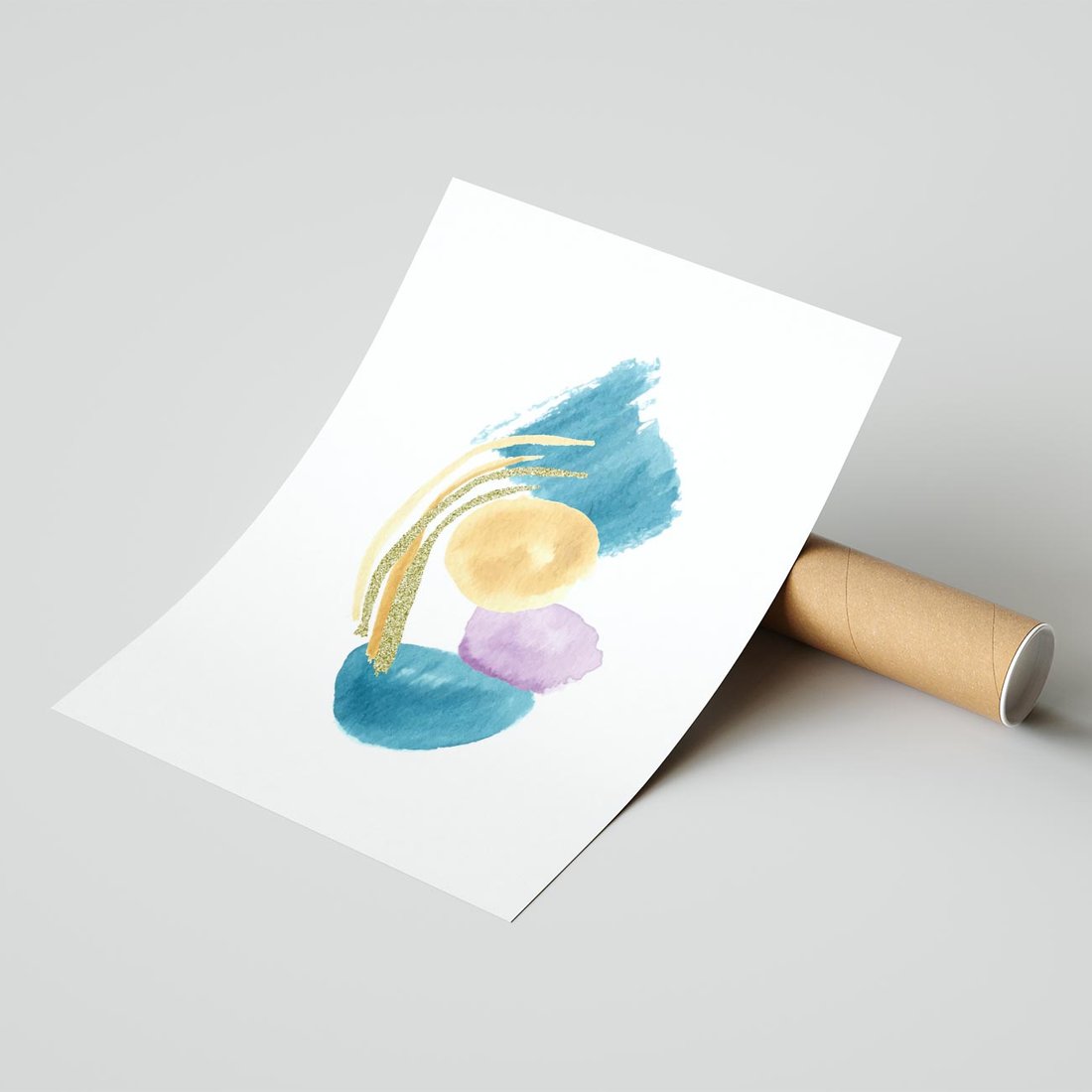 Nasz minimalistyczny plakat to wyjątkowa abstrakcja, gdzie akwarelowe plamy w odcieniach błękitu harmonijnie łączą się z delikatnymi złotymi kreskami. To spokojne dzieło sztuki, które wprowadzi do Twojej przestrzeni subtelność i elegancję, jednocześnie zachęcając do refleksji nad formą i kolorem.