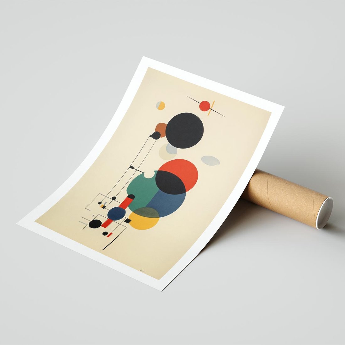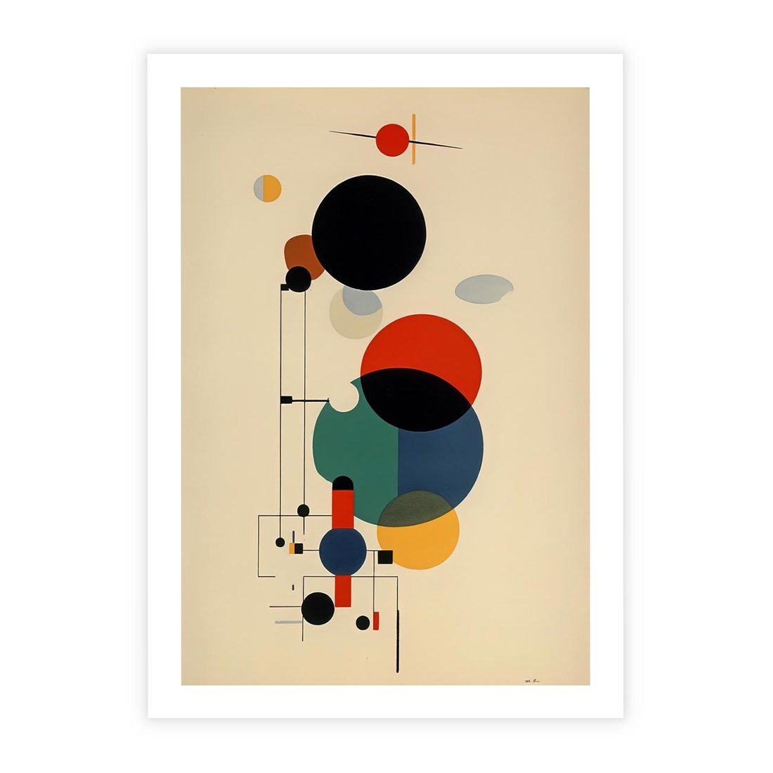 Ta abstrakcyjna geometryczna kompozycja inspirowana stylem Kandinsky'ego łączy w sobie elementy kół i linii, tworząc dynamiczną i ekspresyjną wizję. Ten wpływ dodaje głębi i emocji temu obrazowi.