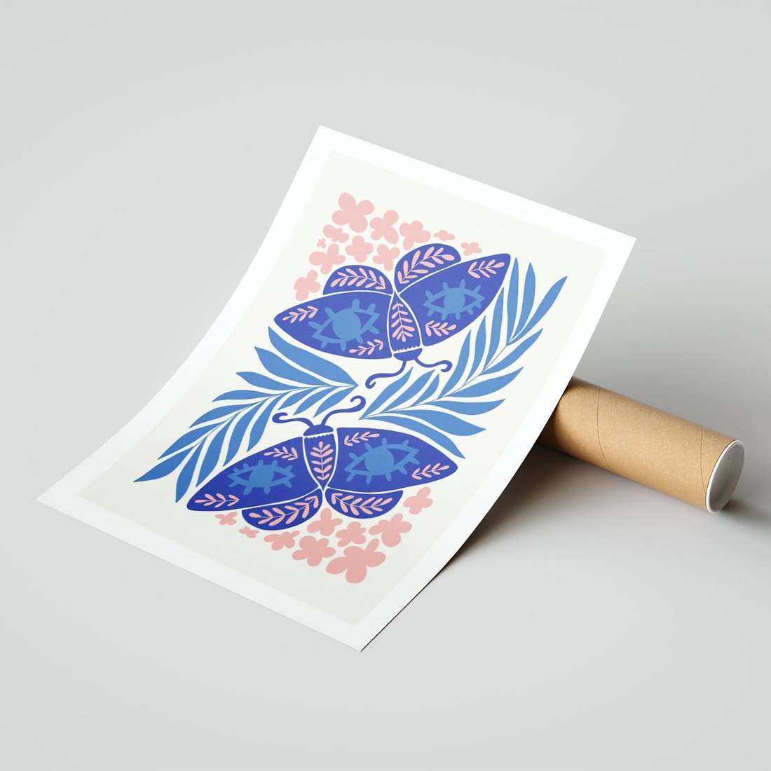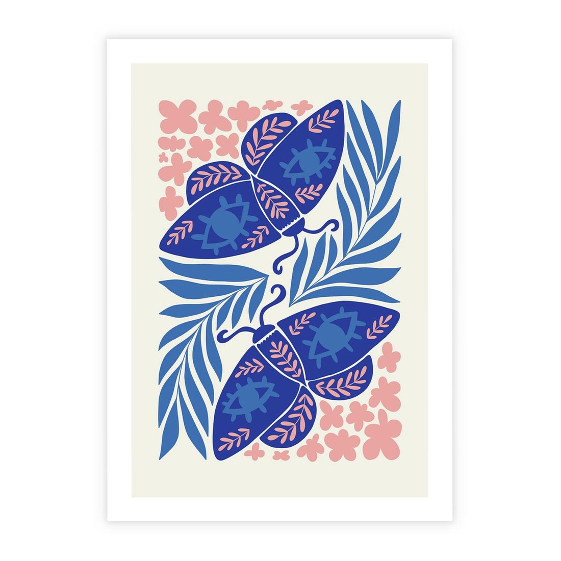 Ten nowoczesny plakat przedstawia abstrakcyjne spotkanie między kwiatami a ćmami, łącząc białe tło z delikatnym pastelowym różem i granatem. Sztuka ta tworzy niezwykłe połączenie natury i abstrakcji, zachęcając do refleksji nad relacjami między różnymi elementami świata.