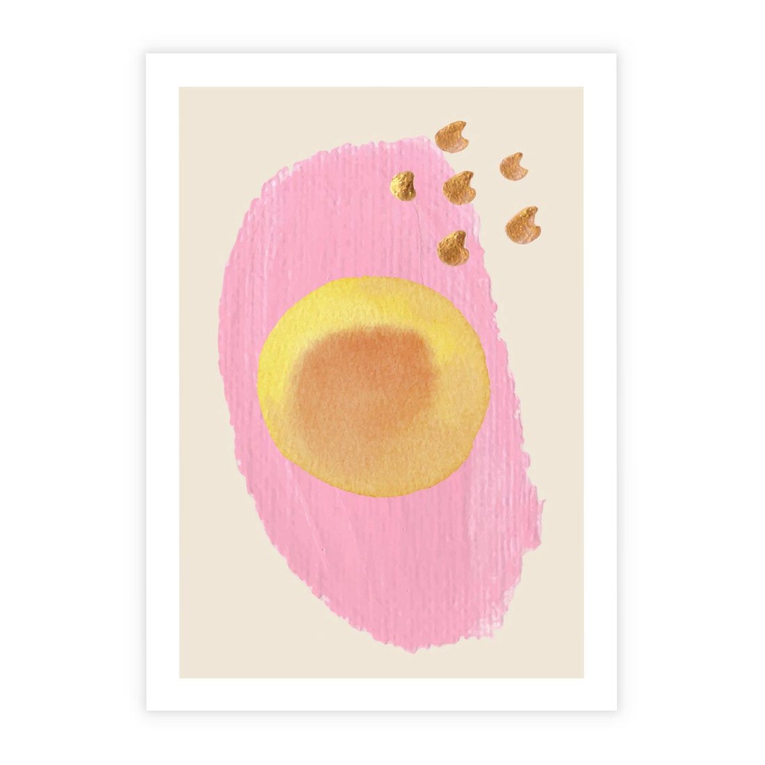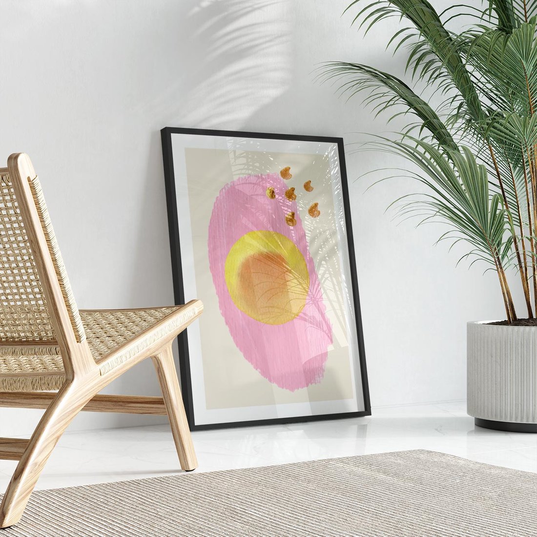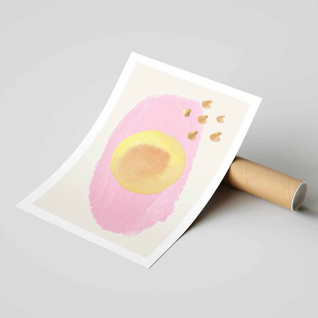 Nasz minimalistyczny plakat to abstrakcyjna różowa plama w akwarelowej technice, zdobiona subtelnie złotymi plamami. To wyjątkowe dzieło sztuki wprowadzi delikatność i elegancję do Twojej przestrzeni, zachwycając wyrafinowaną prostotą i subtelnością.