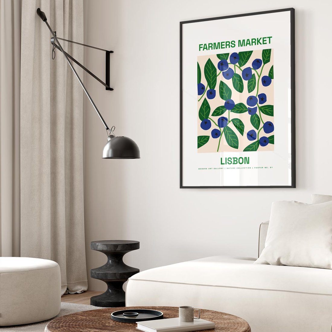 Ten plakat to połączenie sztuki nowoczesnej z naturą, prezentujący borówki, jagody i rośliny w wyrazistej kompozycji. Przy użyciu nowoczesnej typografii, wprowadza do przestrzeni świeżość i naturalny urok, przypominając o pięknie otaczającego nas świata.