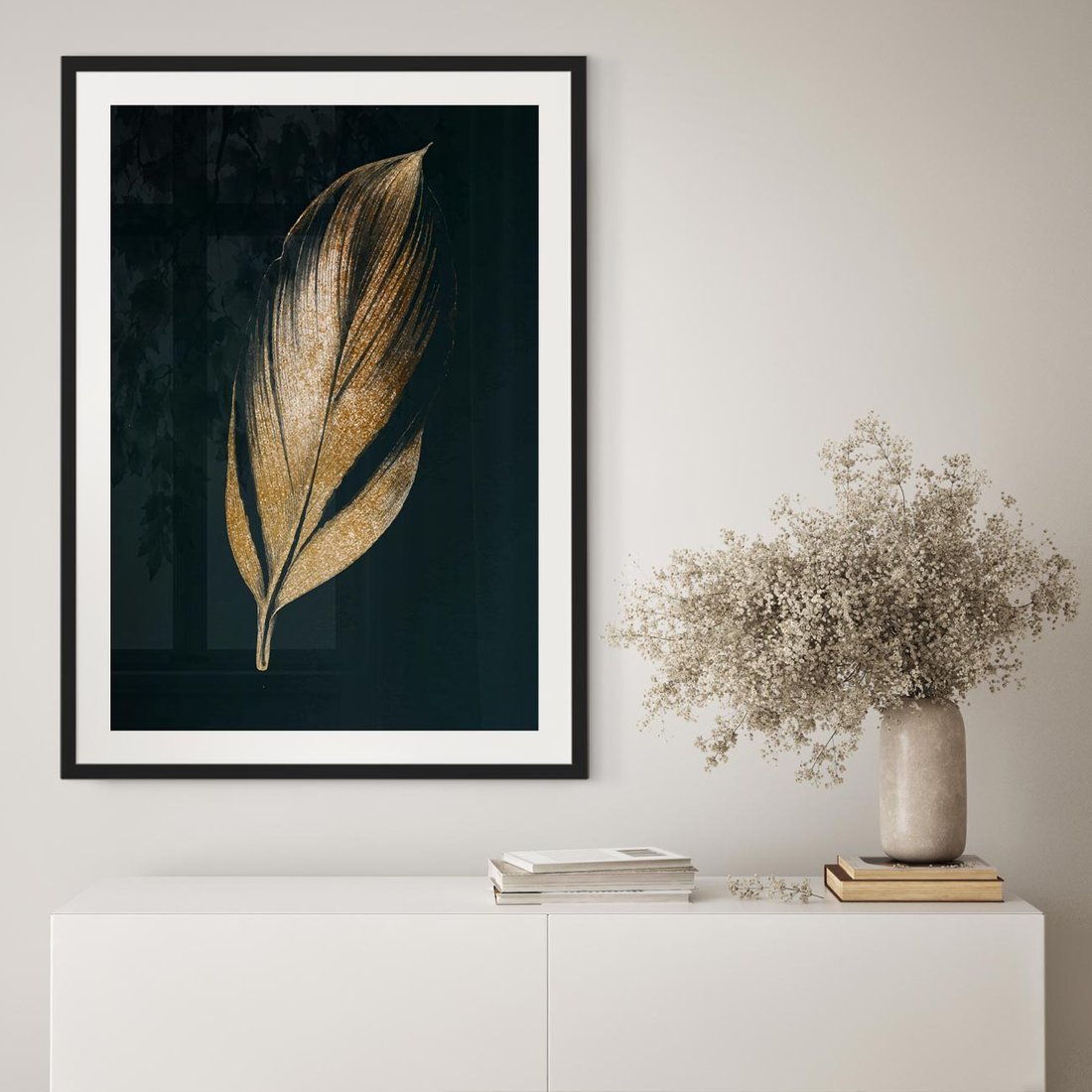Nowoczesna grafika przedstawiająca złoty liść na czarnym tle tworzy mroczny i tajemniczy klimat, który doskonale wpisuje się w estetykę loftu. Złoty liść wyróżnia się na czerni, co przyciąga uwagę i nadaje grafice eleganckiego charakteru. Ten kontrast między złotem a czernią może być zarówno wyrazem luksusu, jak i tajemniczości. Taka grafika może doskonale zdobić przestrzeń loftową, dodając jej wyjątkowego uroku i wyrazistości, zarówno w formie obrazu, jak i plakatu.
