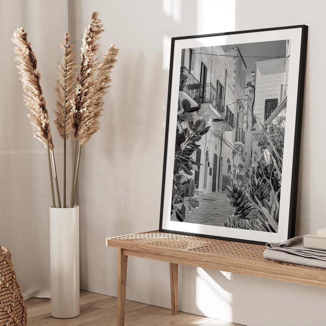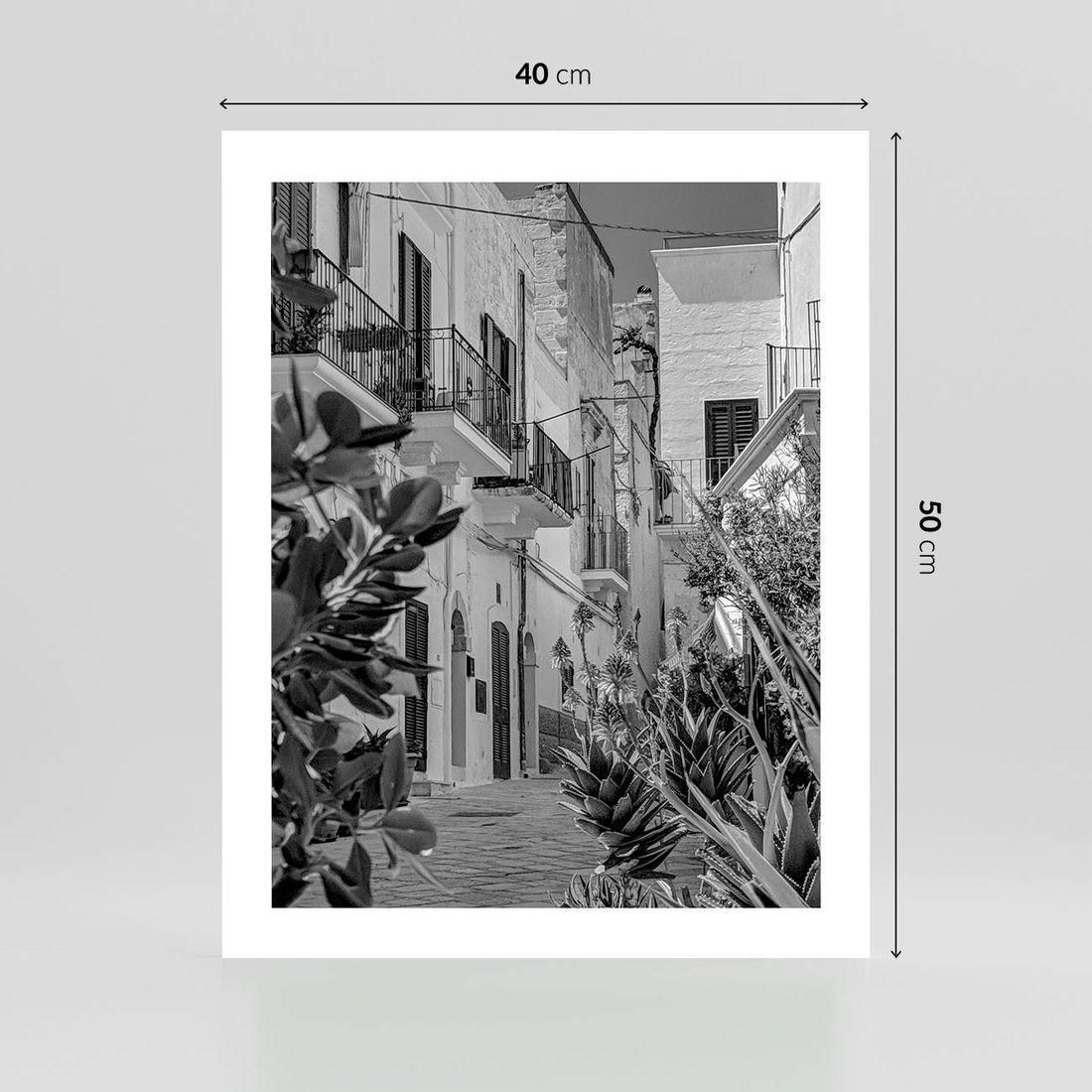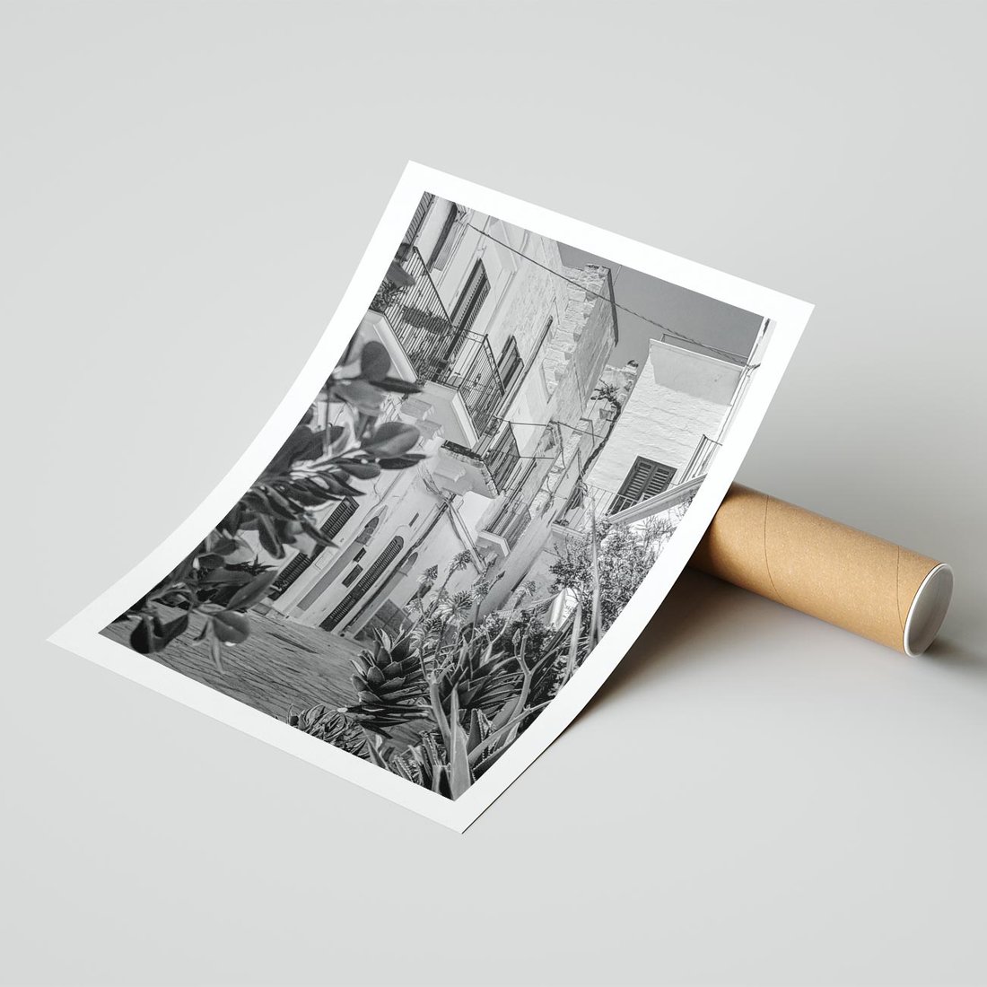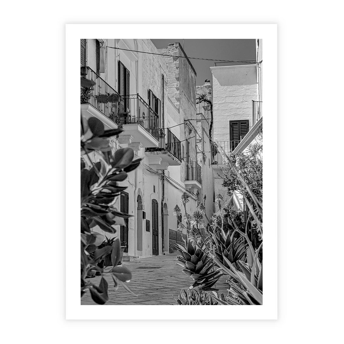 To czarno-białe zdjęcie przedstawia urokliwą uliczkę w nadmorskim mieście na południu Europy, być może we Włoszech lub Grecji. Ulica wydaje się być spokojnym zakątkiem, gdzie kamienne budynki sąsiadują ze sobą, tworząc malowniczą scenerię. Zdjęcie oddaje urok historycznej architektury i atmosferę tego miejsca, a brak kolorów skupia uwagę na detalach i strukturach budynków oraz uliczki. To idealna dekoracja dla miłośników kultury śródziemnomorskiej i romantycznych krajobrazów.